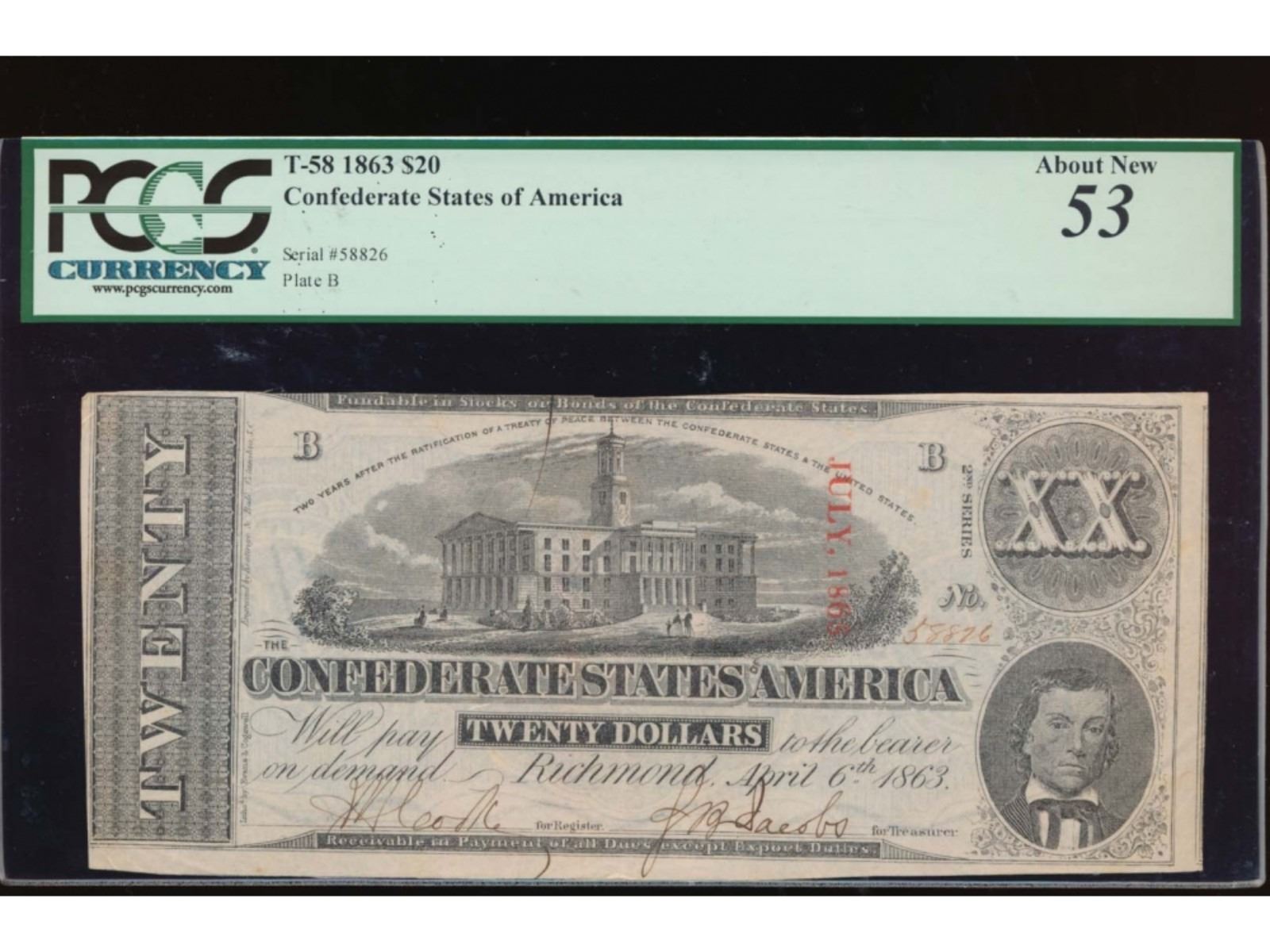 One 1863 $20 Confederate States of America Note PCGS 53.