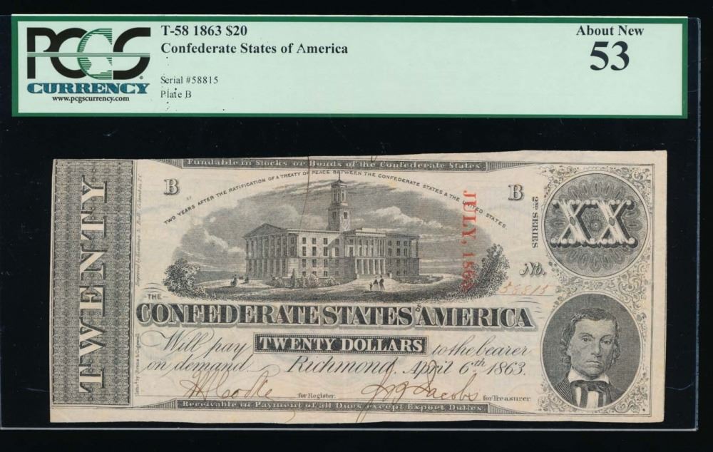 One 1863 $20 Confederate States of America Note PCGS 53.
