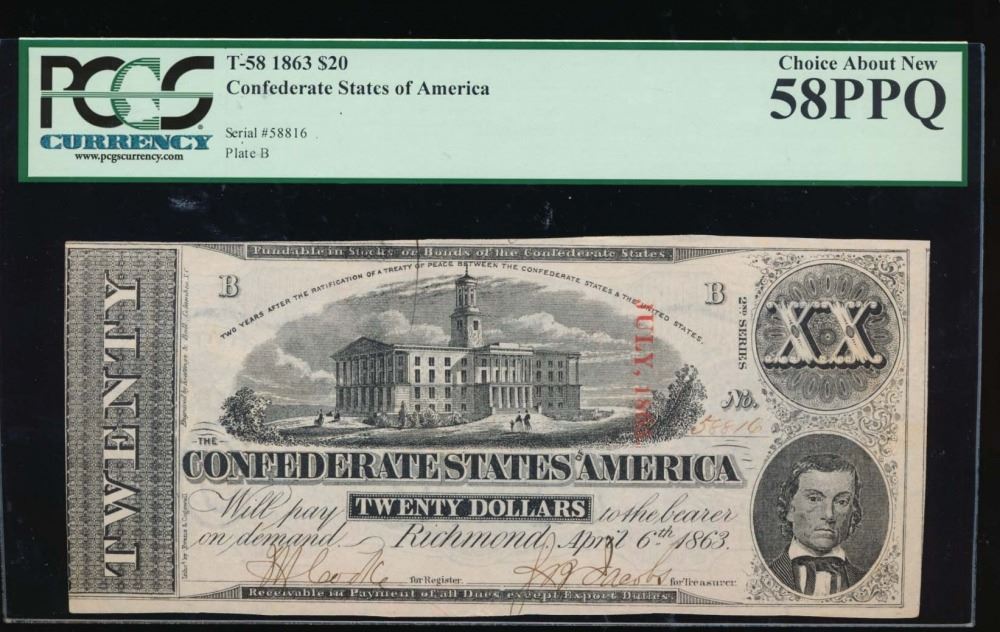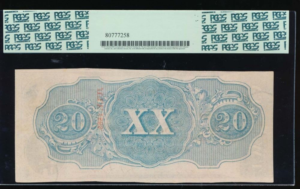 One 1863 $20 Confederate States of America Note PCGS 58PPQ.