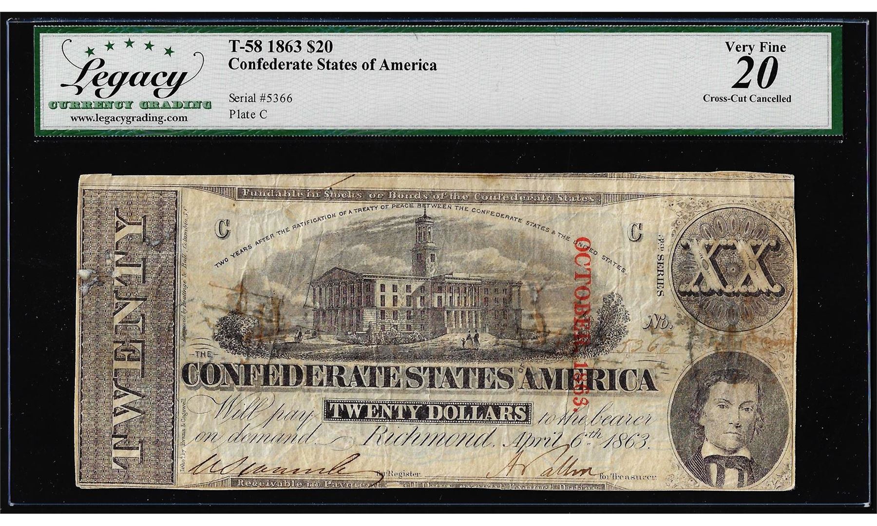 One 1863 $20 Confederate States of America Note T-58 Legacy Very Fine 20 Cut Cancelled. Legacy Graded.