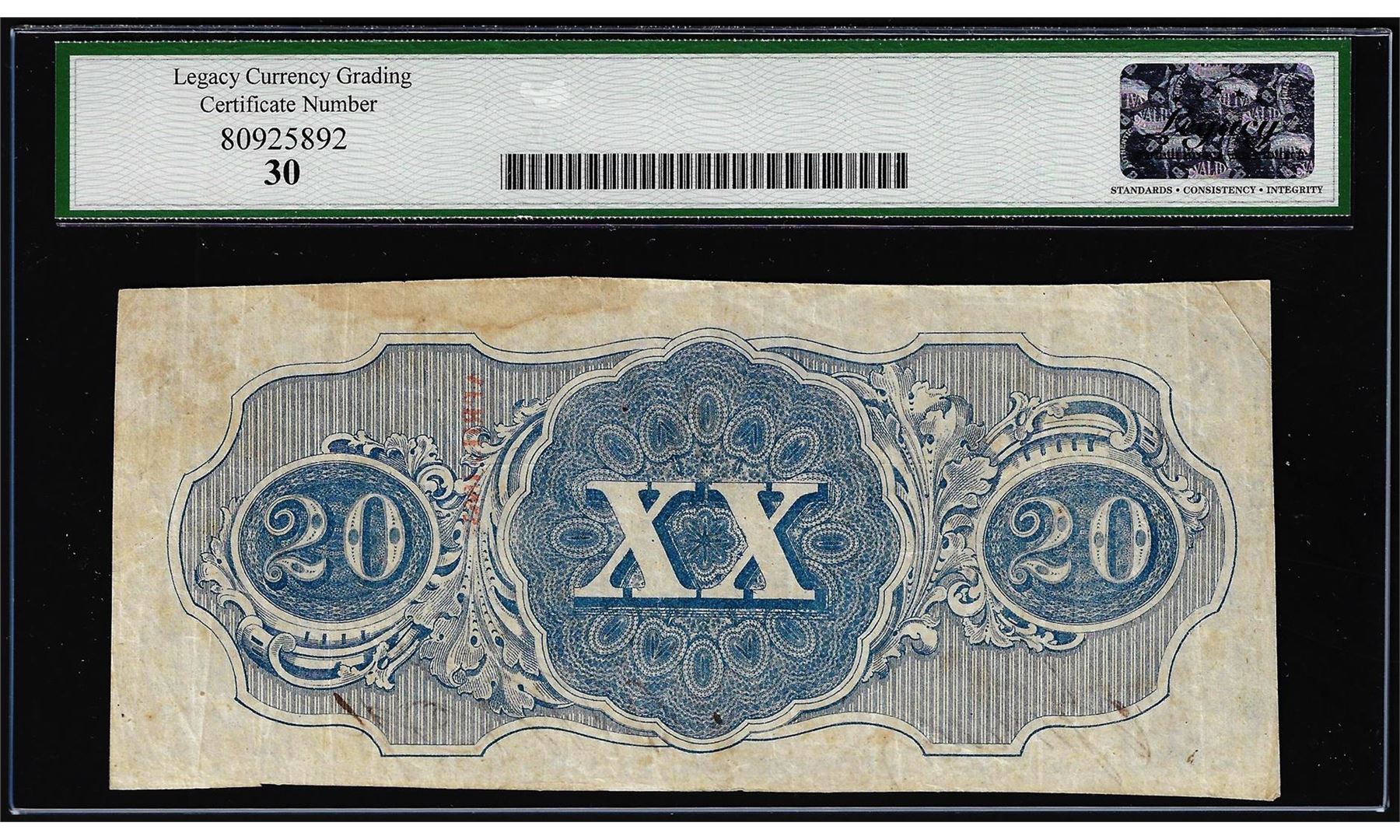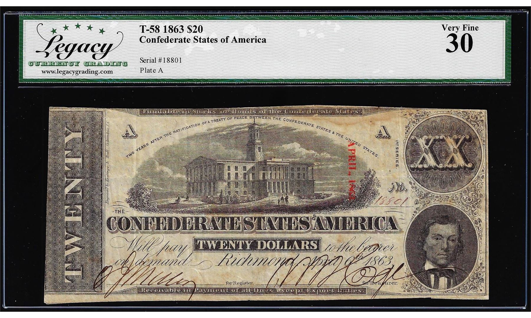 One 1863 $20 Confederate States of America Note T-58 Legacy Very Fine 30. Legacy Graded.
