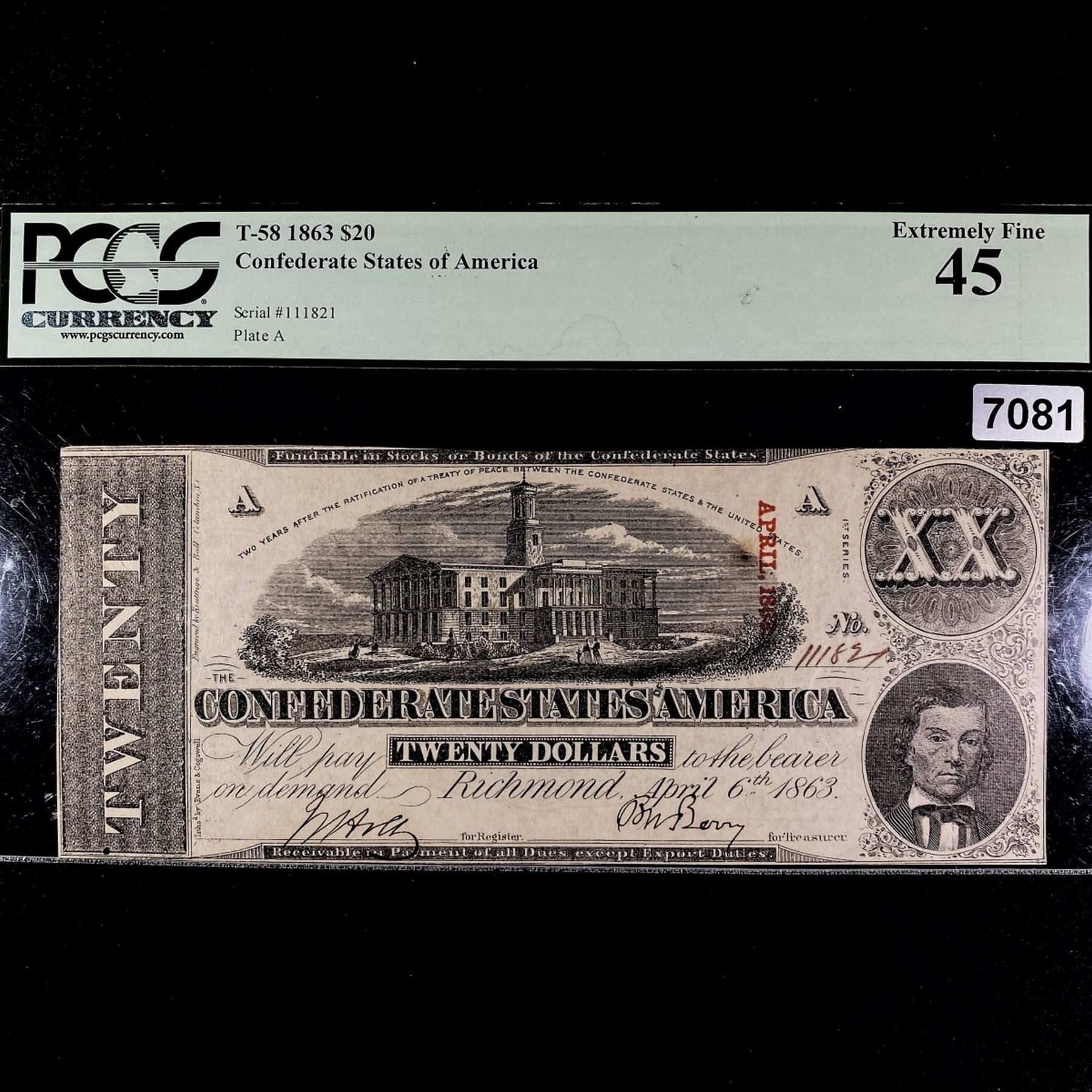 1863 $20 Dollar Confederate States Note PCGS-45XF