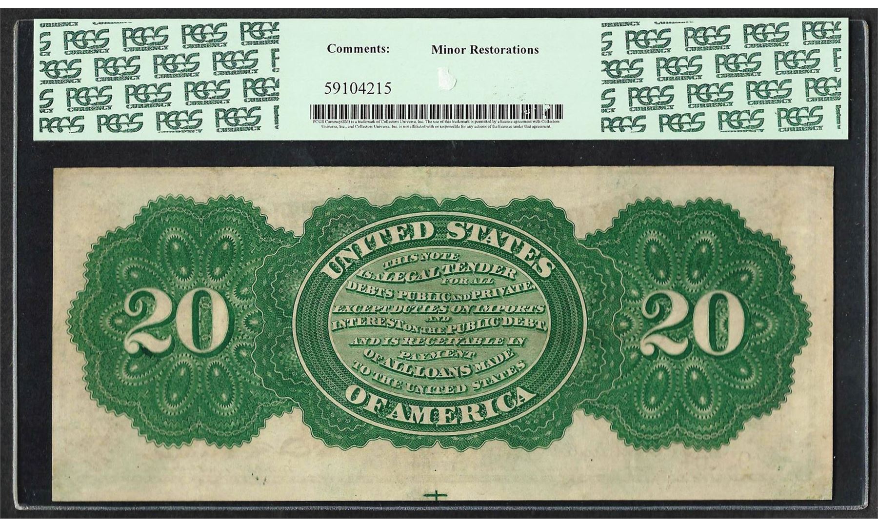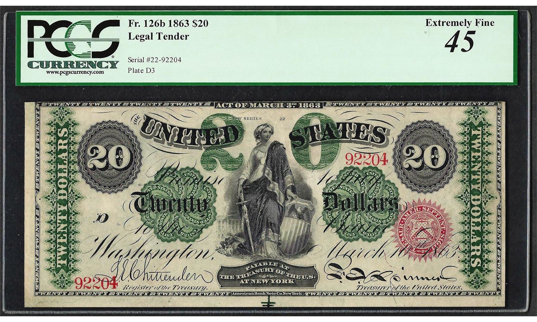 One 1863 $20 Legal Tender Note Fr.126b PCGS Extremely Fine 45. PCGS Graded.