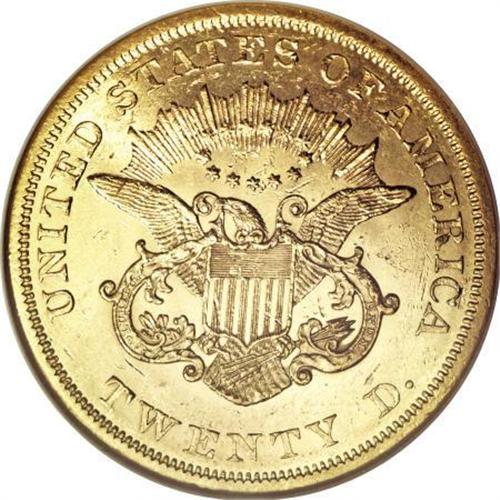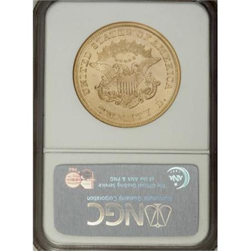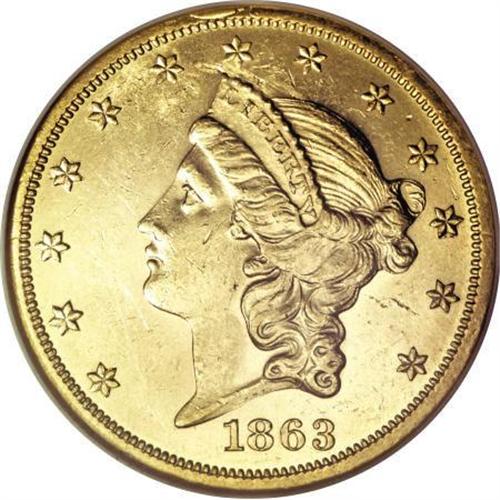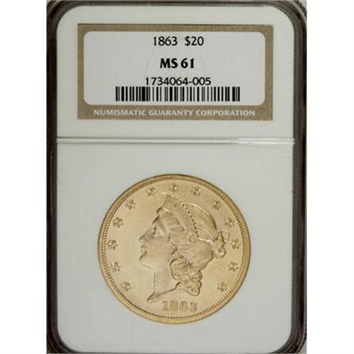 <B>1863 $20 MS61 NGC.</B></I> The treasures of the <I>S.S. Central America, </B></I>the <I>S.S. Republic, </B></I>and the <I>S.S. Brother Jonathan </B></I>ensure that many Type One double Eagles are available for type collectors, but nearly all of those coins are from the San Francisco Mint. Examples from the Philadelphia Mint are extremely rare by comparison, especially in Mint State grades.<BR> This splendid example has bright yellow surfaces with satiny luster and reflective fields. It is sharply defined with full obverse and reverse design details. A late die state, the obverse has a small rim break over the left side of star 7, just before 12 o'clock. Such rim breaks or cuds on gold coins are seldom seen. Census: 6 in 61, 8 finer (3/08).<BR><BR><B>Coin Engraver:</B> James B. Longacre<BR><BR><b>Shipping:</b> Coins & Currency (<a target="_blank" href="http://www.heritageauctions.com/common/shipping.php">view shipping information</a>)