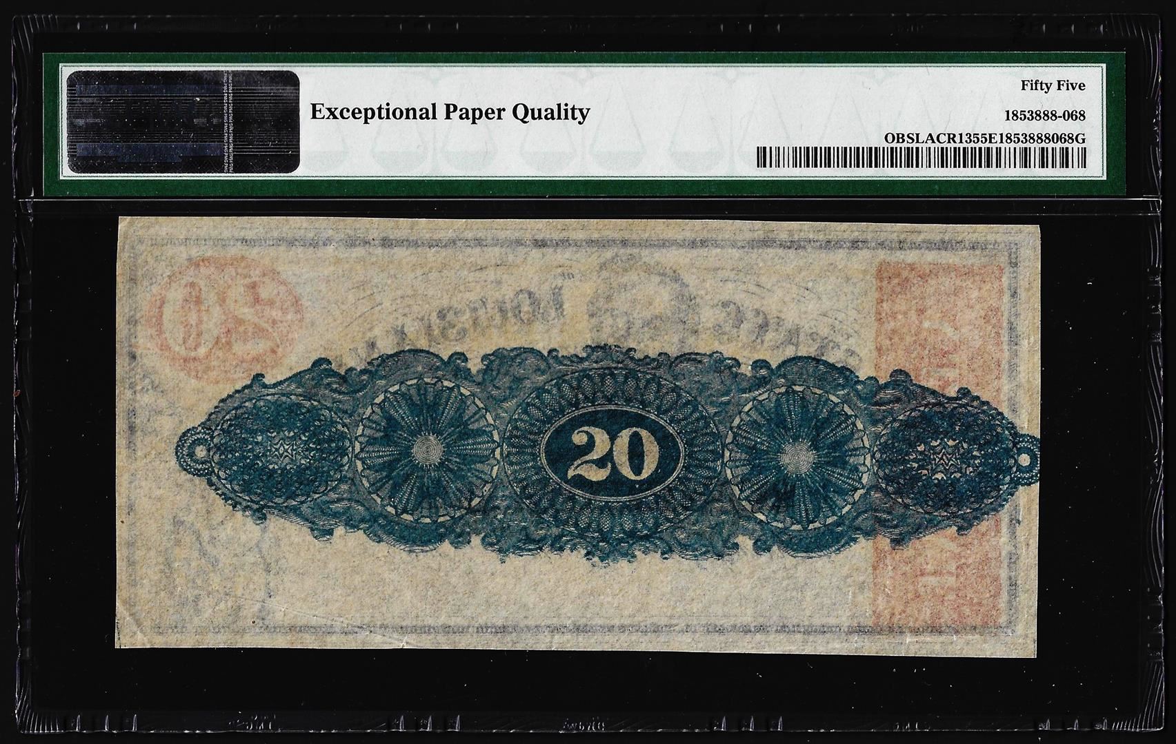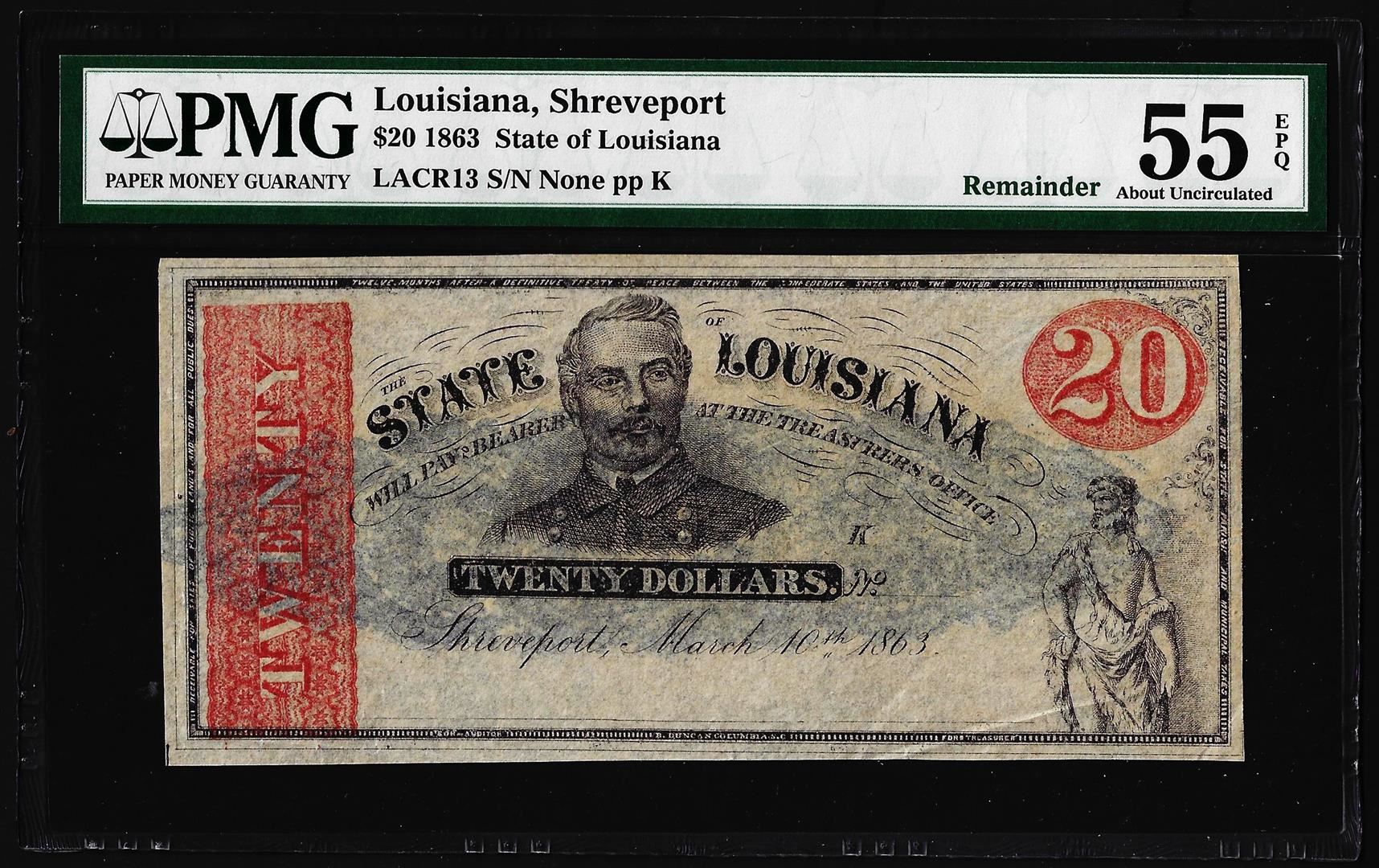 One 1863 $20 State of Louisiana Obsolete Note Cr.13 PMG About Uncirculated 55EPQ. PMG Certified.