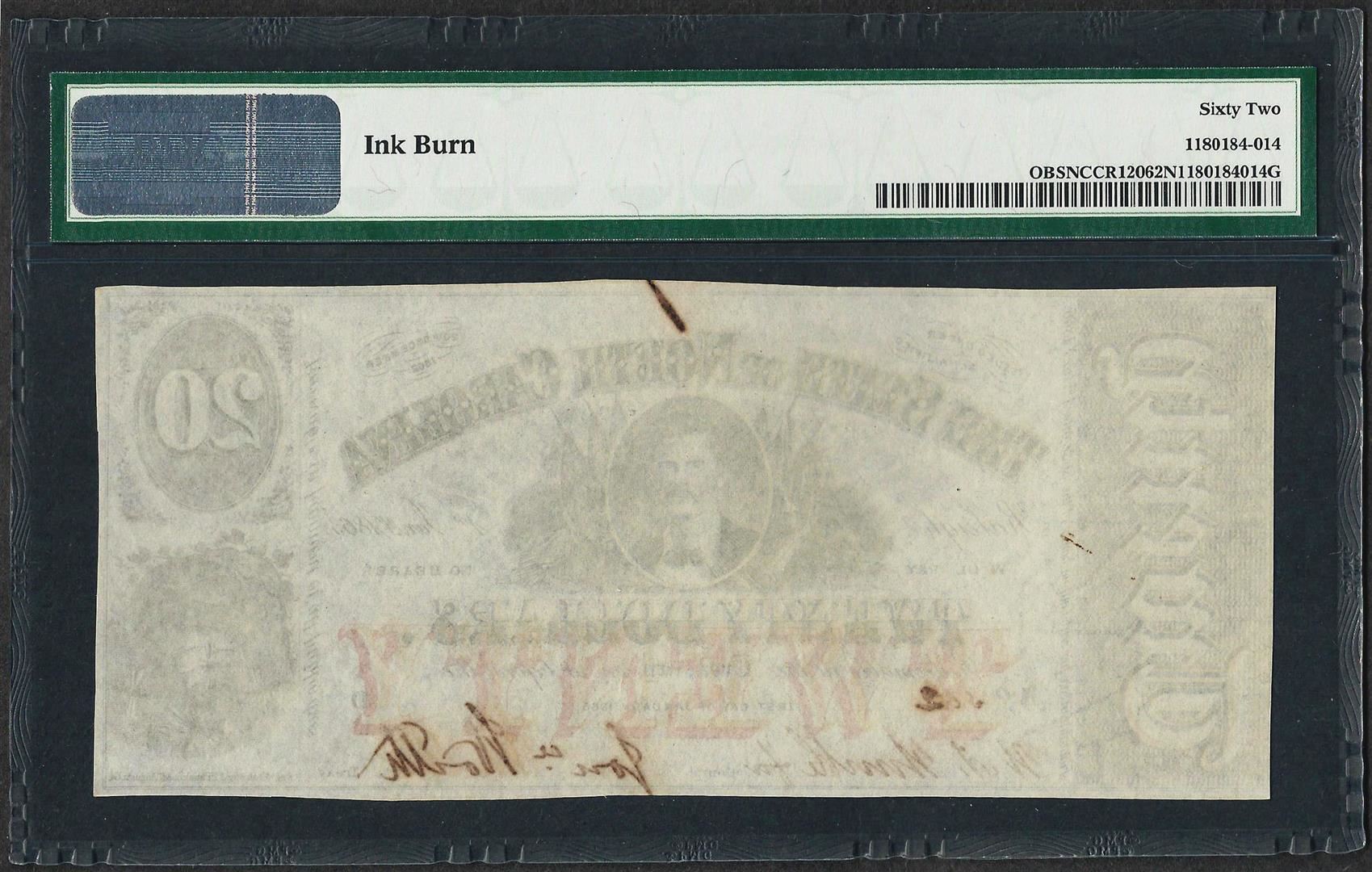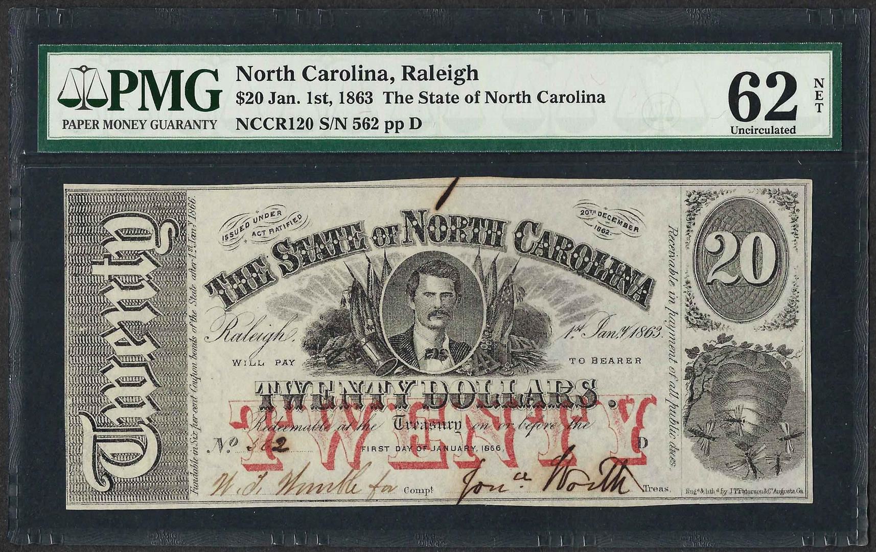 1863 $20 The State of North Carolina Obsolete Note PMG Uncirculated 62 Net