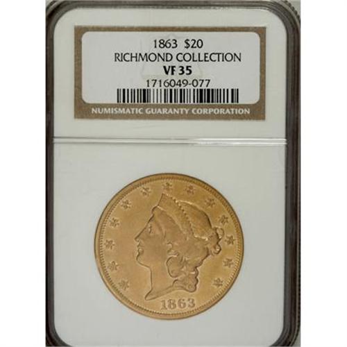 <B>1863 $20 VF35 NGC.</B></I> Ex: Richmond Collection. An issue that is rare in all grades, despite a moderate mintage of 142,790 pieces. Proofs were the preferred collecting vehicle of the era, not Mint State business strikes. This piece has likely traded hands before the era of certification as XF or even AU, since there are few abrasions for the assigned grade and much eye appeal, a function of the wonderful deep orange-gold coloration and remaining luster on each side.<BR><BR><B>Coin Engraver:</B> James B. Longacre<BR><BR><b>Shipping:</b> Coins & Currency (<a target="_blank" href="http://www.heritageauctions.com/common/shipping.php">view shipping information</a>)
