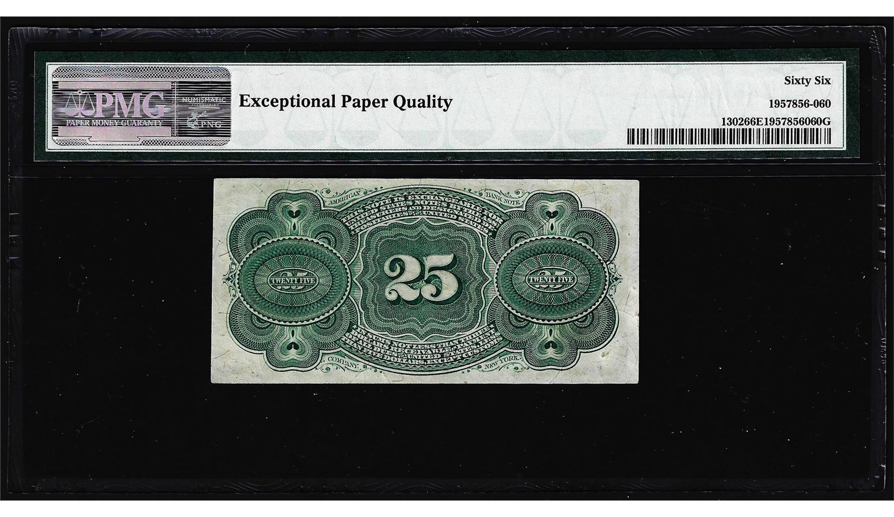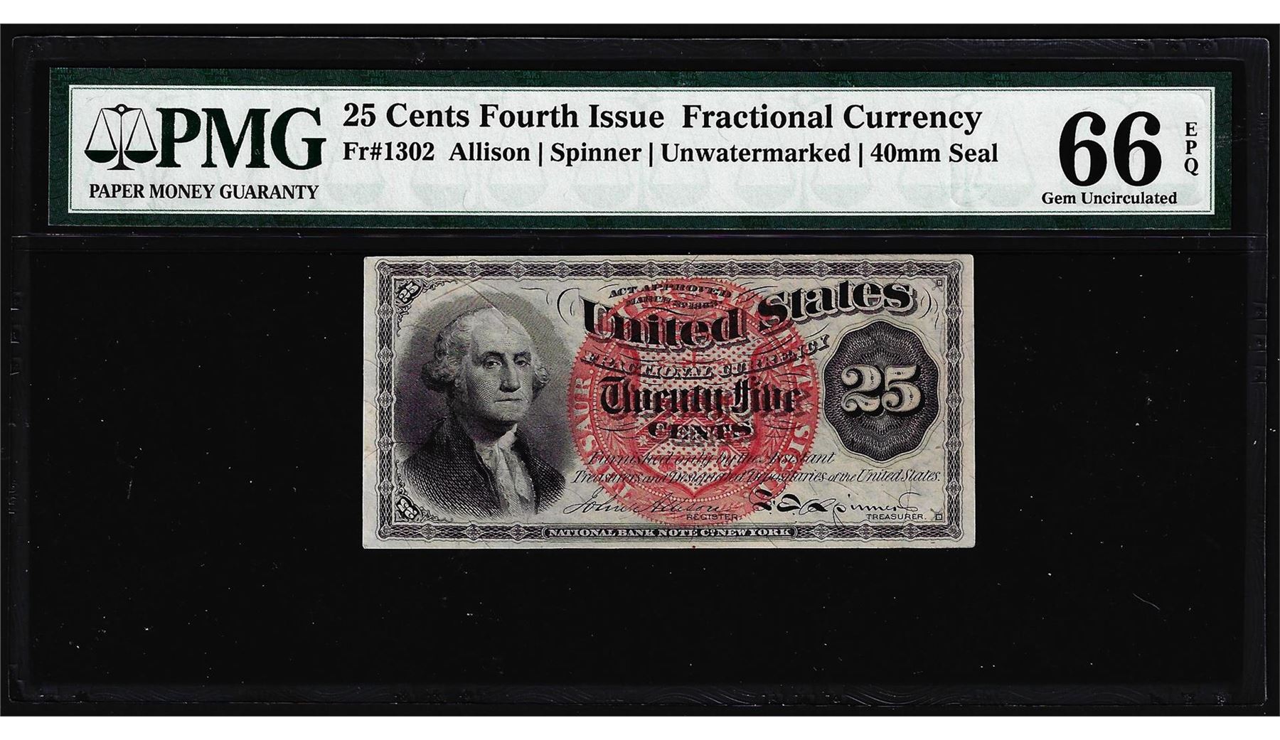 One 1863 25 Cent 4th Issue Fractional Currency Note Fr.1302 PMG Choice Uncirculated 66EPQ. PMG Certified.