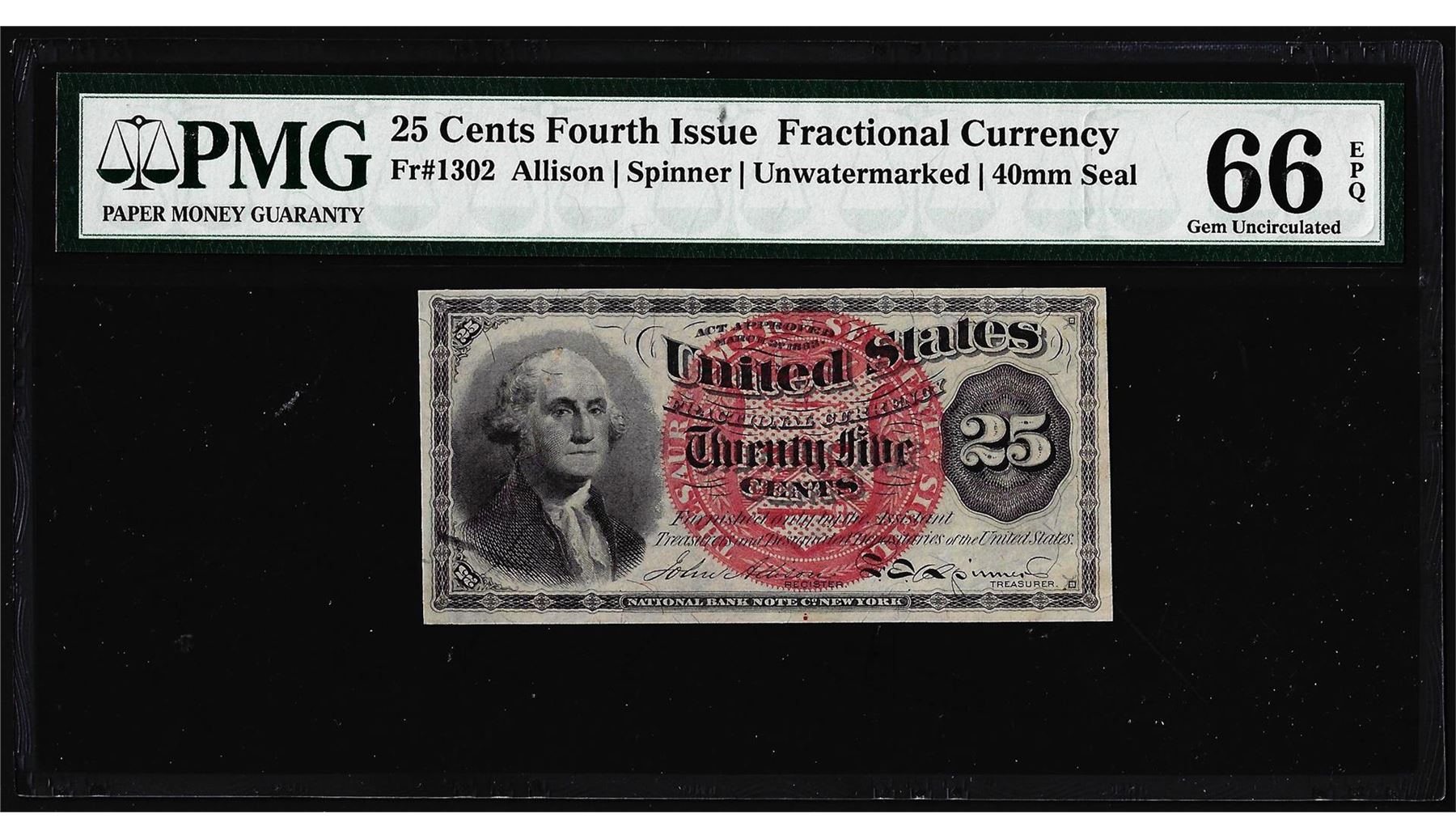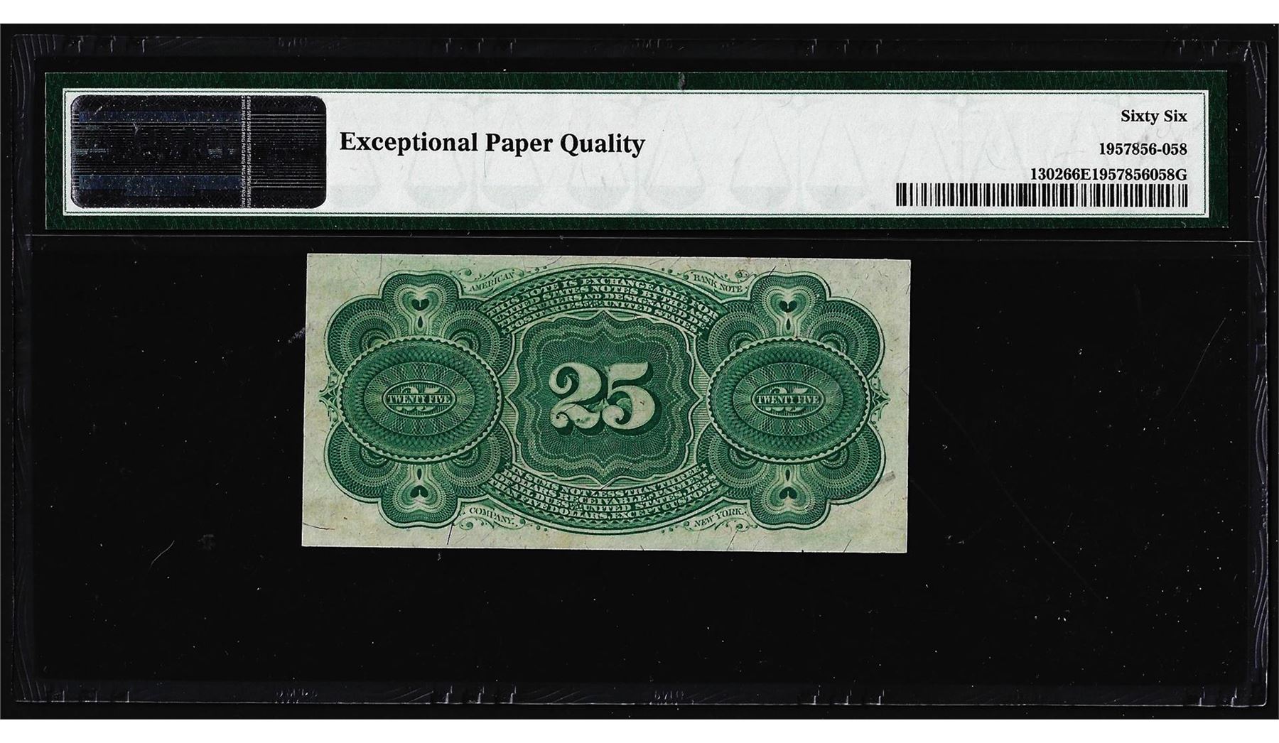 One 1863 25 Cent 4th Issue Fractional Currency Note Fr.1302 PMG Choice Uncirculated 66EPQ. PMG Certified.