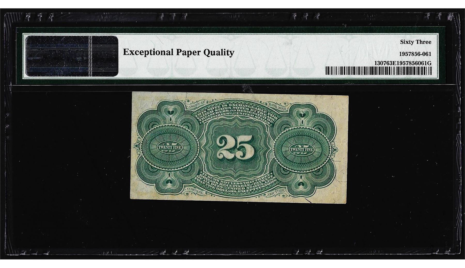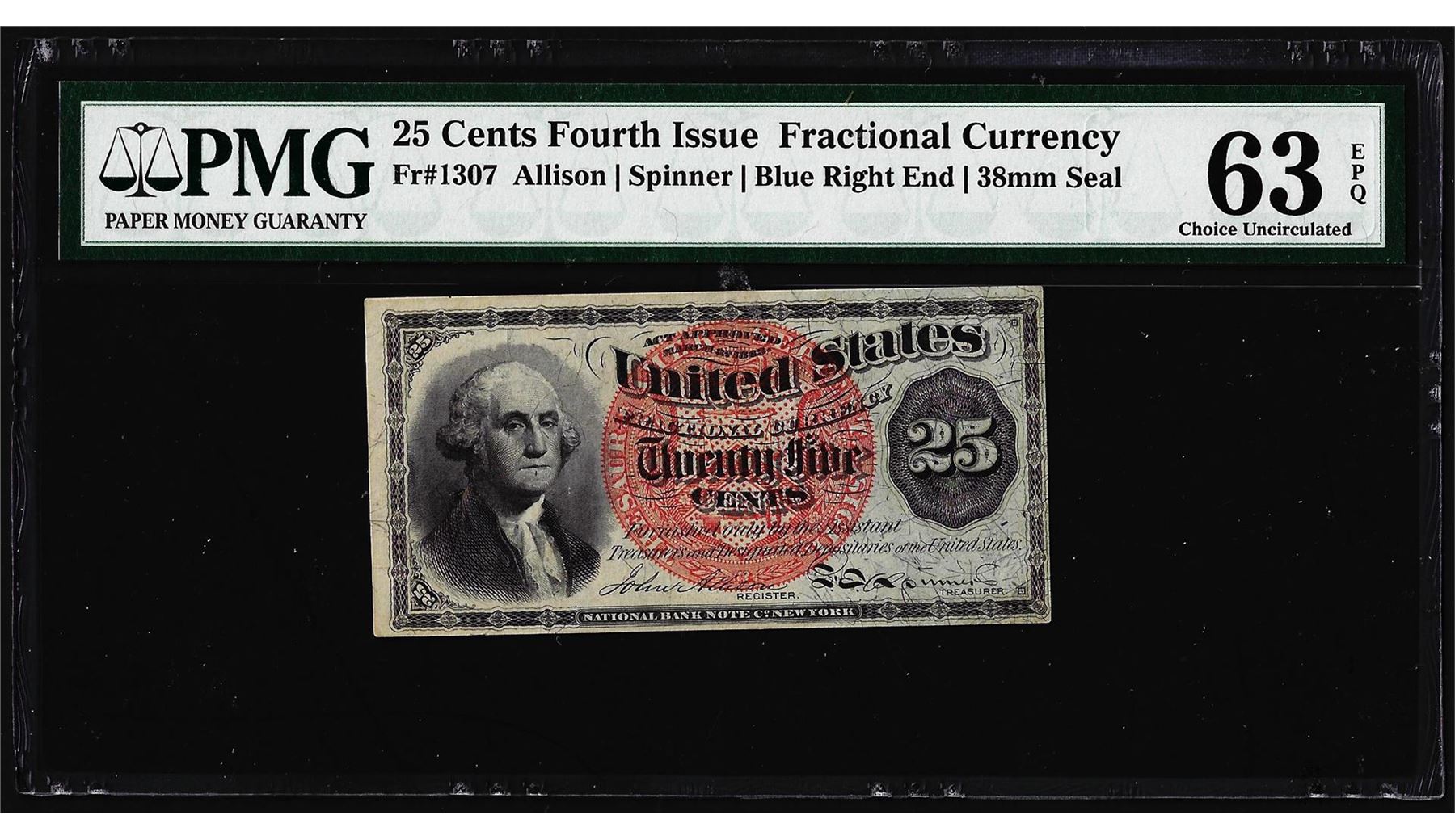One 1863 25 Cent 4th Issue Fractional Currency Note Fr.1307 PMG Choice Uncirculated 63EPQ. PMG Certified.