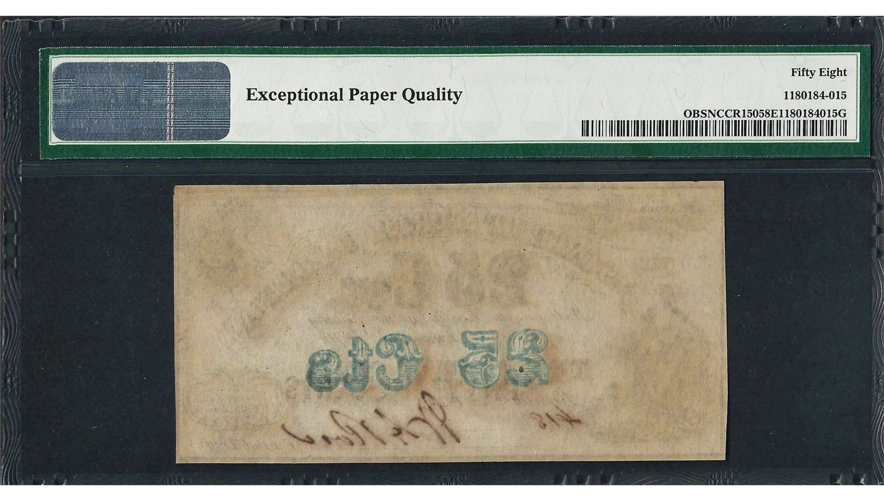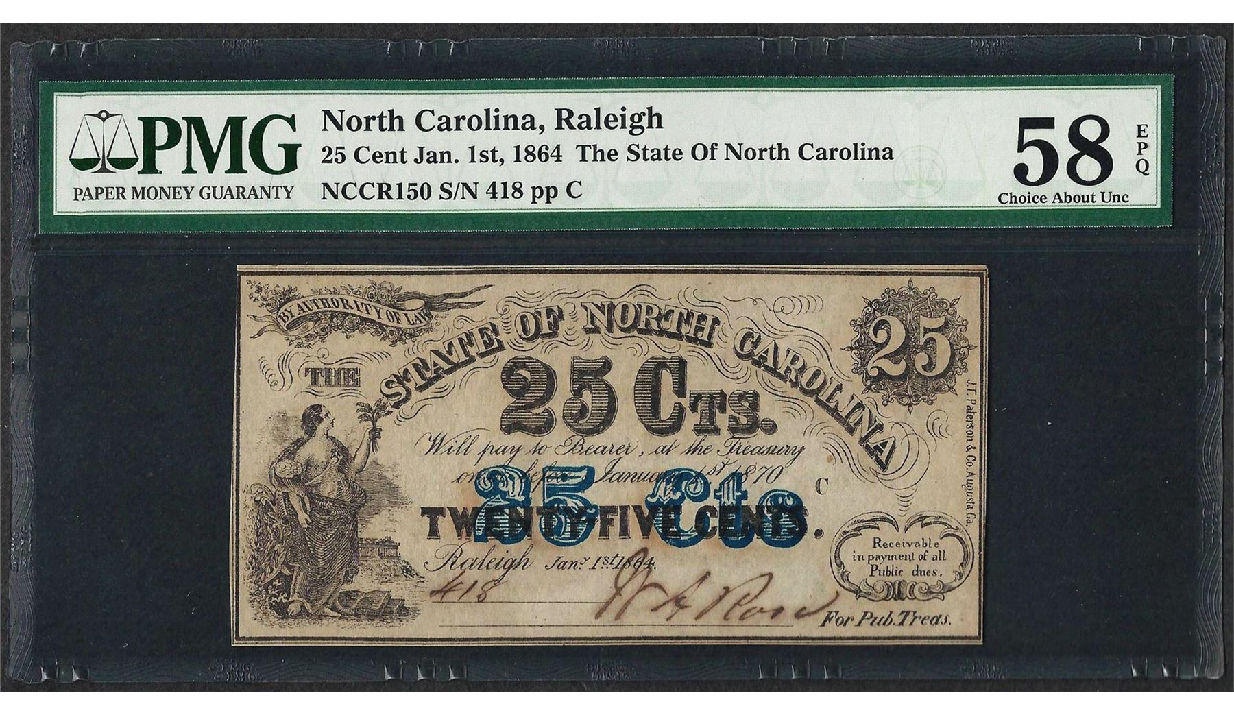 One 1863 25 Cent State of North Carolina Obsolete Note PMG Choice About Uncirculated 58EPQ. PMG Certified.