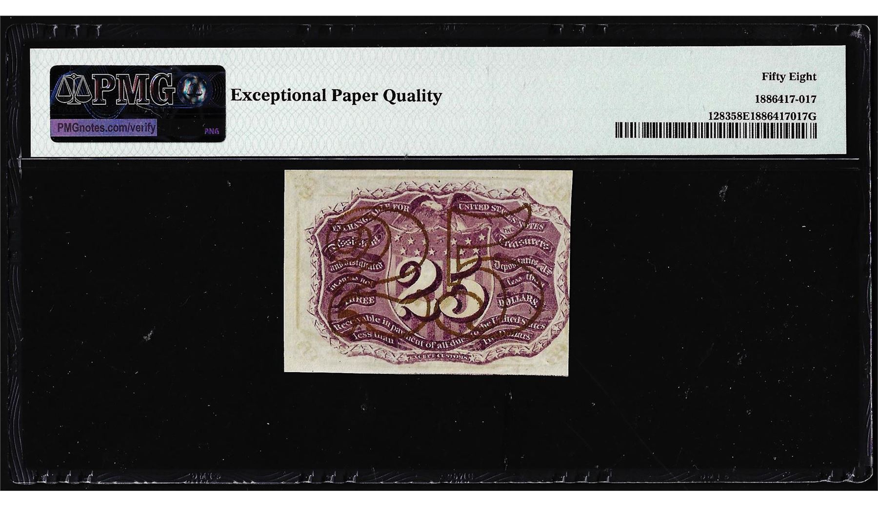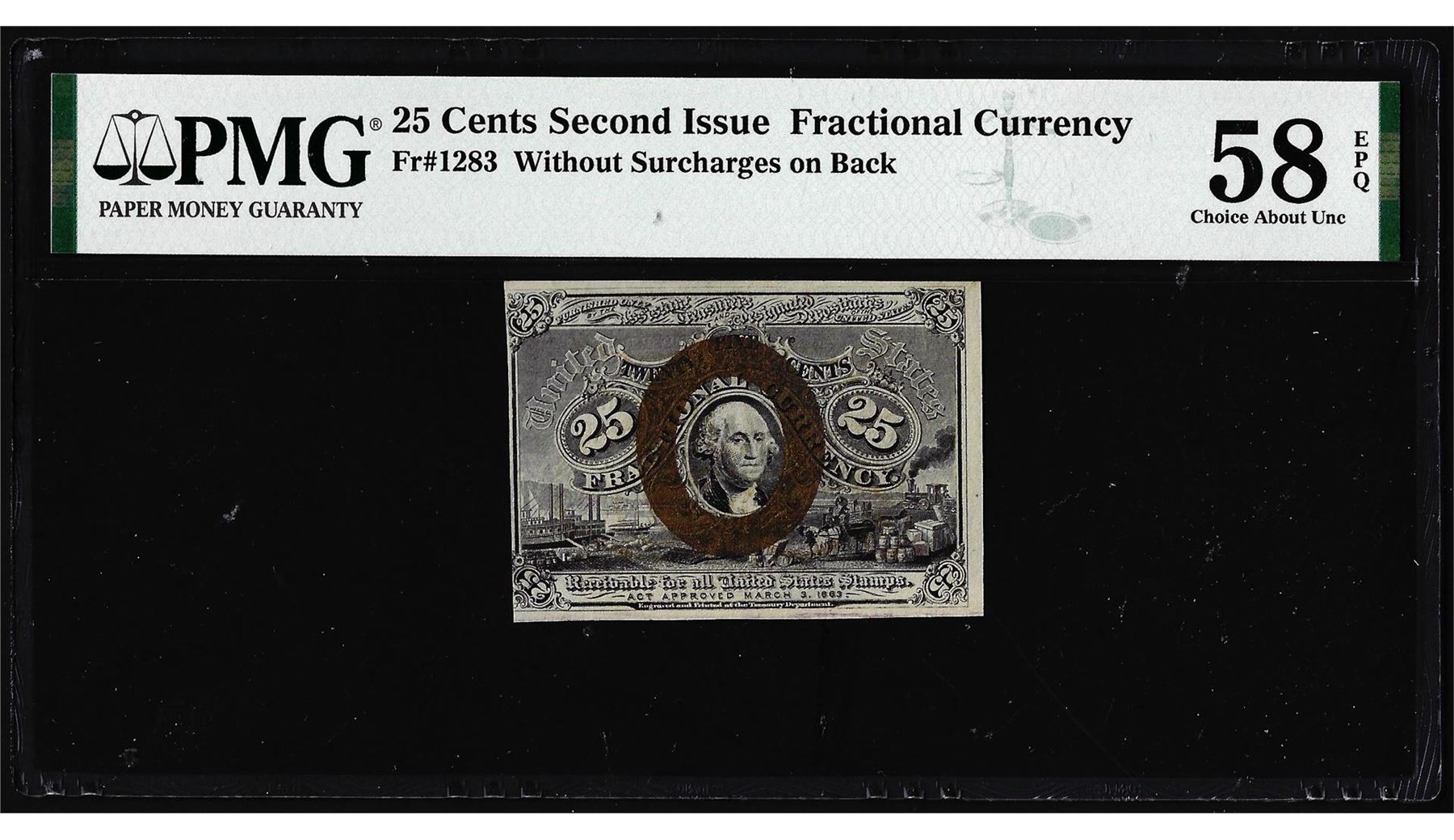 One 1863 25 Cents Second Issue Fractional Note Fr.1283 PMG Ch. About Uncirculated 58EPQ. PMG Certified.