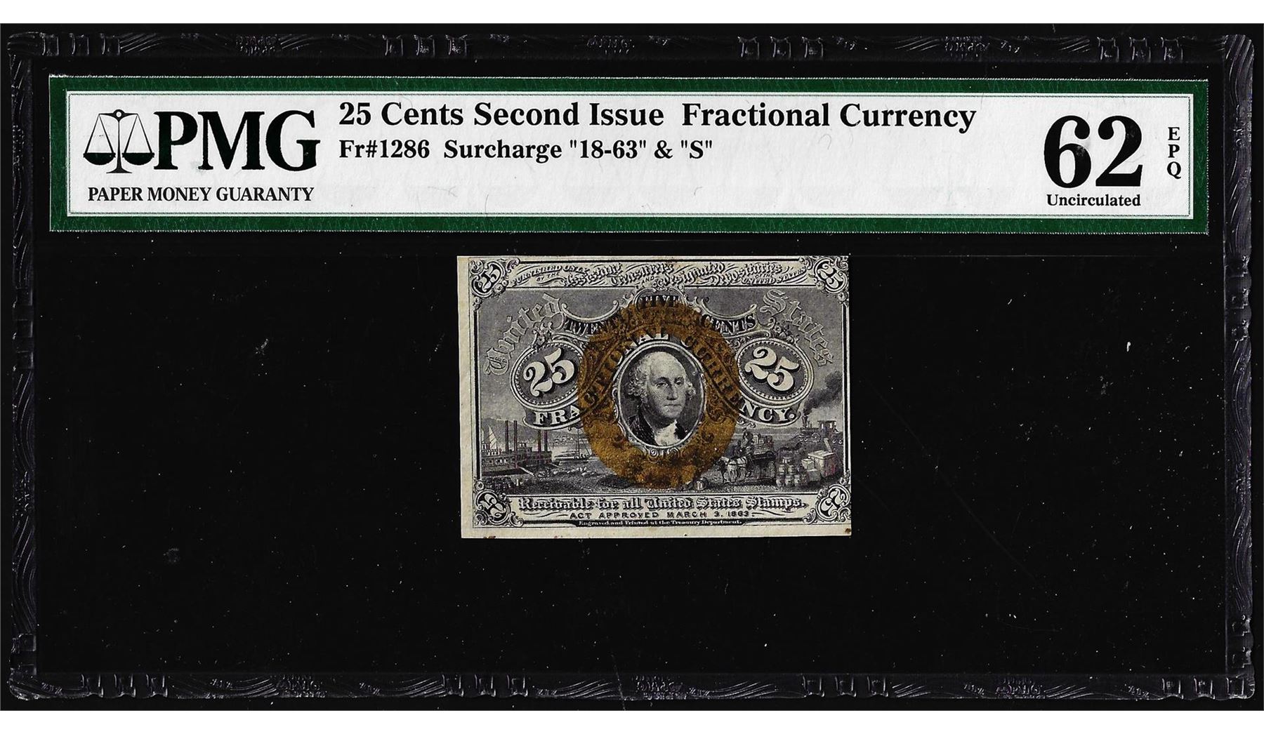 One 1863 25 Cents Second Issue Fractional Note Fr.1286 PMG Uncirculated 62EPQ.
