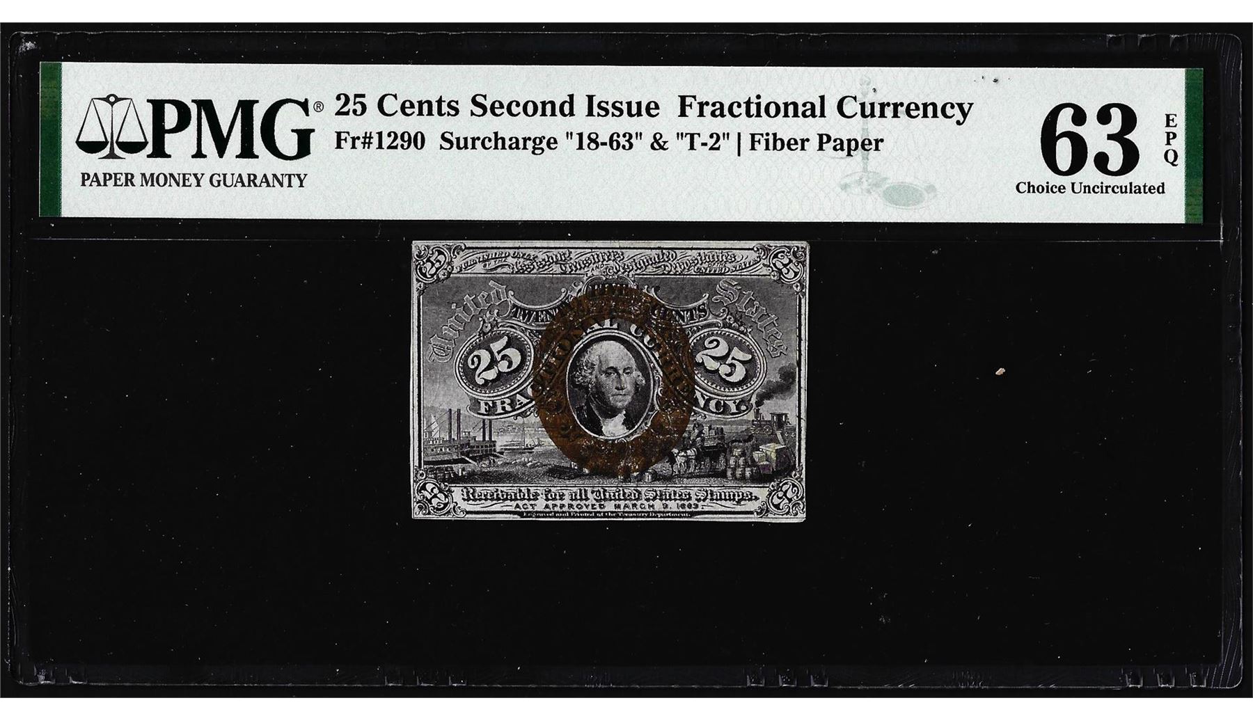 One 1863 25 Cents Second Issue Fractional Note Fr.1290 PMG Choice Uncirculated 63EPQ. PMG Certified.