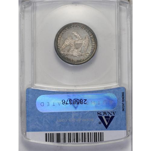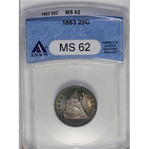 <B>1863<25C> MS62 ANACS.</B></I> A lustrous example with a somewhat prooflike reverse. Blue and yellow-orange patina graces the obverse, while the dove-gray reverse fields and ivory devices create a partial cameo effect. Long, thin abrasions in the obverse fields help define the grade.<BR><I>Ex: Stack's, 7/52, lot 444.</B></I><BR><I>From The Redfjord Collection.</B></I>