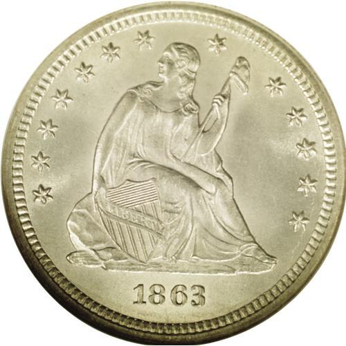 <B>1863<25C> MS65 NGC.</B></I> The 1863 is a highly respected Civil War issue. Only 191,140 business strikes were produced and high grade survivors are very difficult to locate. Undoubtedly, most of the mintage was either melted or exported during the War. This is a brilliant example that has bright, satiny surfaces with a semi-reflective appearance on the reverse. Fully struck throughout, there are no obvious or distracting blemishes on either side of this lovely Gem. Census: 8 in 65, 6 finer (2/06).