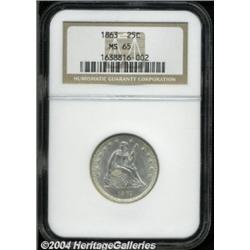 <table><tbody><tr><td><table> <TR><TD width="100%"><TABLE cellSpacing=1 cellPadding=3 width="100%" border=0><TBODY><TR><TD width="100%" bgColor=#79735c><FONT face=arial color=#ffffff size=3><B>Description</B> </FONT></TD></TR><TR><TD width="100%" bgColor=#ffffff><FONT face=arial size=2><B>1863 25C MS65 NGC.</B></I> The 1863 is a highly respected Civil War issue. Only 191,140 business strikes were produced and high grade survivors are very difficult to locate. Undoubtedly, most of the mintage was either melted or exported during the War. This is a brilliant example that has bright, satiny surfaces with a semi-reflective appearance on the reverse. Fully struck throughout, there are no obvious or distracting blemishes on either side of this lovely Gem. Population: 11 in 65, 5 finer (11/03). </FONT></TD></TR></TBODY></TABLE></TD></TR></TBODY></TABLE><BR><A name=PricesRealized></A><TABLE cellSpacing=0 cellPadding=0 width="100%" bgColor=#000000 border=0><TBODY><TR><TD width="100%"><TABLE cellSpacing=1 cellPadding=3 width="100%" border=0><TBODY><TR><TD width="100%" bgColor=#79735c><A name=PR><FONT face=arial color=#ffffff size=3><B>Previous Prices from Heritage Auctions</B> </FONT></A></TD></TR><TR><TD bgColor=#f6f6ed><TABLE cellSpacing=0 cellPadding=0 width="100%" border=1><TBODY><TR><TD align=middle width="33%"><B>Date</B></TD><TD align=middle width="33%"><B>Service</B></TD><TD align=middle width="33%"><B>Price</B></TD></TR><TR bgColor=whitesmoke><TD width="33%"><B>10/30/2001</B></TD><TD width="33%">PCGS</TD><TD width="33%">$3,500.00</TD></TR><TR bgColor=whitesmoke><TD width="33%"><B>11/23/2002</B></TD><TD width="33%">NGC</TD><TD width="33%">$3,450.00</TD></TR><TR bgColor=whitesmoke><TD width="33%"><B>06/03/1994</B></TD><TD width="33%">NGC</TD><TD width="33%">$2,310.00</TD></TR><TR bgColor=whitesmoke><TD width="33%"><B>05/01/1995</B></TD><TD width="33%">NGC</TD><TD width="33%">$2,200.00</TD></TR></TBODY></TABLE></TD></TR><TR><TD bgColor=#ffffff><FONT face=arial size=1 ?>PLEASE NOTE: All prices realized reflect the final hammer price PLUS the buyer's premium in auctions that charge a buyer's premium. Each item has a notation at the top of the listing indicating whether that lot included a buyer's premium. Example: A item that sells with a final hammer price of $100 and a 20% buyer's premium will display with a price realized of $120. All information listed is intended to be as accurate as possible, but errors are possible. Please use this guide carefully and inform us of any inaccuracies. </FONT></TD></TR></TBODY></TABLE></TD></TR></TBODY></TABLE><BR><TABLE cellSpacing=0 cellPadding=0 width="100%" bgColor=#000000 border=0><TBODY><TR><TD width="100%"><TABLE cellSpacing=1 cellPadding=3 width="100%" border=0><TBODY><TR><TD width="100%" bgColor=#79735c colSpan=6><FONT face=arial color=#ffffff size=3><B>Price Guide*</B> </FONT></TD></TR><TR bgColor=#f6f6ed><TD align=middle><B>Grade</B> </TD><TD align=middle><B>Coin World<BR>(Trends)</B> </TD><TD align=middle><B>Numismedia<BR>Retail</B> </TD><TD align=middle><B>Numismedia<BR>Wholesale</B> </TD><TD align=middle><B>Coin<BR>Universe</B> </TD><TD align=middle><B>Heritage<BR>Value Index</B> </TD></TR><TR bgColor=#ffffff><TD align=middle>64</TD><TD align=right>$2,500.00</TD><TD align=right>---</TD><TD align=right>$1,875.00</TD><TD align=right>$1,250.00</TD><TD align=right>$1,167.50</TD></TR><TR style="FONT-WEIGHT: bold" bgColor=#cccfdd><TD align=middle>65</TD><TD align=right>---</TD><TD align=right>---</TD><TD align=right>$3,750.00</TD><TD align=right>$4,175.00</TD><TD align=right>$2,946.25</TD></TR><TR bgColor=#ffffff><TD align=middle>66</TD><TD align=right>---</TD><TD align=right>---</TD><TD align=right>$5,250.00</TD><TD align=right>$6,750.00</TD><TD align=right>$6,012.50</TD></TR><TR bgColor=#ffffff><TD colSpan=6><FONT size=1>*All information listed is intended to be as accurate as possible, but errors are possible. No item may be returned or refused based on this information which is provided as a service to our customers. You should contact each pricing source directly to determine the accuracy of this information. </FONT></TD></TR></TBODY></TABLE></TD></TR></TBODY></TABLE><BR><TABLE cellSpacing=0 cellPadding=0 width="100%" bgColor=#000000 border=0><TBODY><TR><TD width="100%"><TABLE cellSpacing=1 cellPadding=3 width="100%" border=0><TBODY><TR><TD width="100%" bgColor=#79735c><FONT face=arial color=#ffffff size=3><B>Population Guide</B> </FONT></TD></TR><TR bgColor=#ffffff><TD align=middle><!-- Begin Output of Population Grid--><TABLE cellSpacing=0 cellPadding=0 width="100%" border=0><TBODY><TR><TD vAlign=center><TABLE cellSpacing=0 width="100%" border=1 cellsadding="3"><TBODY><TR><TD vAlign=center><TABLE cellSpacing=0 cellPadding=3 width="100%" border=1><TBODY><TR><TD vAlign=center align=middle bgColor=#f0f1e8 colSpan=2 <CENTER><FONT face=Arial size=2><B>PCGS Pop </B></FONT><CENTER></CENTER></TD><TD vAlign=center align=middle bgColor=#f0f1e8 colSpan=2><CENTER><FONT face=Arial size=2><B>NGC Pop</B></CENTER></FONT></TD></TR><TR><TD vAlign=center><FONT face=Arial size=2>(65)</FONT> </TD><TD vAlign=center align=right><FONT face=Arial size=2>14</FONT> </TD><TD vAlign=center><FONT face=Arial size=2>(65)</FONT> </TD><TD vAlign=center align=right><FONT face=Arial size=2>11</FONT> </TD></TR><TR><TD vAlign=center><FONT face=Arial size=2>(>65)</FONT> </TD><TD vAlign=center align=right><FONT face=Arial size=2>6</FONT> </TD><TD vAlign=center><FONT face=Arial size=2>(>65)</FONT> </TD><TD vAlign=center align=right><FONT face=Arial size=2>5</FONT> </TD></TR></TBODY></TABLE></TD></TR></TBODY></TABLE></TD></TR></TBODY></TABLE><!-- End Output of Population Grid--></TD></TR></TBODY></TABLE></TD></TR></TBODY></TABLE><BR><TABLE cellSpacing=0 cellPadding=0 width="100%" bgColor=#000000 border=0><TBODY><TR> <font color='#000000'><span style='background-color: #FFFFFF'><td bgcolor='#FFFFFE'> Important notice: Heritage usually auctions material at the rate of 200-250 lots per 