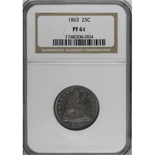 <B>1863 25C PR61 NGC.</B></I> NGC Census: (6/91). PCGS Population (6/139). Mintage: 460. Numismedia Wsl. Price for NGC/PCGS coin in PR61: $510. (#5559)<BR><BR><B>Coin Engraver:</B> Christian Gobrecht<BR><BR><b>Shipping:</b> Coins & Currency (<a target="_blank" href="http://www.heritageauctions.com/common/shipping.php">view shipping information</a>)