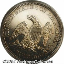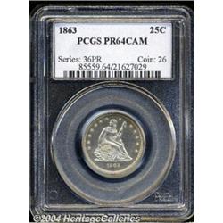 <B>1863<25C> PR64 Cameo PCGS.</B></I> This beautiful Civil War issue is exquisitely struck, and exhibits a strong contrast between the frosty devices and highly reflective fields. The obverse is faintly toned in gold hues, while the reverse shows russet, lavender, and aqua-blue coloration around the lower border. The surfaces are seemingly free of significant marks. A small toning spot is located in the field above Liberty's foot. Previously as lot 433 in the American Auction Association (Bowers and Ruddy) catalog of The Dr. Curtis R. Paxman Collection, sold on November 4, 1974, and cataloged in that sale as "<B>Choice Brilliant Proof.</B></I> A splendid specimen of this elusive issue. Only 460 Proofs were minted this year, and of this number we doubt that more than 100 survive in condition equal to the present lot."<BR><I>From The Willamette Collection.</B></I> <BR><BR><B>Important notice:</B> Heritage usually auctions material at the rate of 200-250 lots per hour. On some occasions eBay Live bid software or the Internet may not be able to keep up with the pace of the auction. We recommend placing a realistic absentee bid now as insurance to avoid disappointment. Occasionally the auctioneer may eliminate or reject an eBay Live bid, and the auctioneer may also reopen a lot after the close of the eBay live bidding (usually because we missed an audience bid), and may reject your bid even if it shows you as the winning bidder. By bidding via eBay Live, you agree that Heritage may award the lot to another bidder at its sole discretion under the circumstances described above or any other reasonable circumstances. Since eBay bids are not shown to us until we open the lot on the floor, we treat those bids just like floor bids. In most cases the floor responds before the eBay bid is presented to us, due to Internet lag time, so for consistency we have made it a policy that floor bids are always considered first over tie eBay live bids. Also please note that all Heritage lots purchased through eBay Live carry a 20% Buyer's Premium. Please make sure you read the Terms and Conditions before you bid. </span></font></tr></table></td></tr></table>