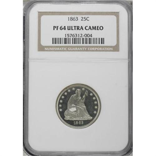 <B>1863 25C PR64 Ultra Cameo NGC.</B></I> A dramatic, black on white beauty with only the slightest hint of gold on the rims. The extreme contrast between the mirrored surfaces and the frosted designs removes all doubt as to the validity of the Ultra Cameo designation. A few stray hairlines appear to account for the grade. <BR><BR><b>Shipping:</b> Coins & Currency (<a target="_blank" href="http://www.heritageauctions.com/common/shipping.php">view shipping information</a>)