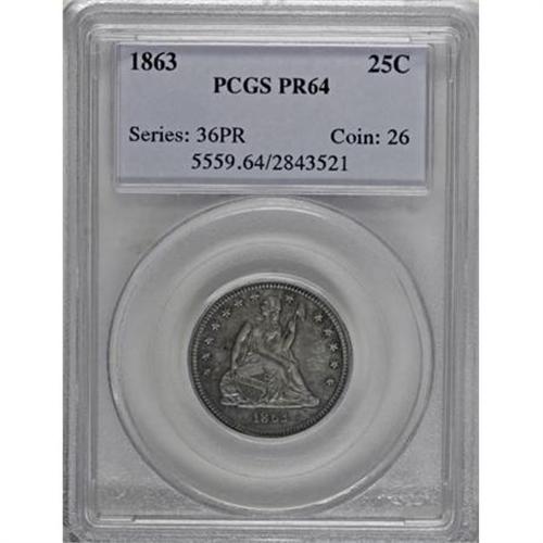 <B>1863 25C PR64 PCGS.</B></I> A blend of cobalt-blue, reddish-orange, and violet patina adorns each side of this near-Gem Civil War era quarter, and a sharp strike brings out strong definition in the design elements. A few minor obverse handling marks define the grade. Population: 54 in 64, 18 finer (8/07).<BR><BR><B>Coin Engraver:</B> Christian Gobrecht<BR><BR><b>Shipping:</b> Coins & Currency (<a target="_blank" href="http://www.heritageauctions.com/common/shipping.php">view shipping information</a>)
