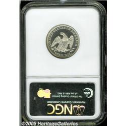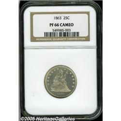 <B>1863 25C PR66 Cameo NGC.</B></I> A razor-sharp premium Gem, the reverse is untoned and possesses imposing white on black contrast. The obverse features delicate tan color which nonetheless does not deny the frost throughout the Seated device. This well preserved piece has a trio of tiny mint-made lintmarks on the obverse field, these are mentioned primarily for pedigree purposes. Only 460 proofs were issued. Population: 1 in 66 Cameo, none finer (2/05).
