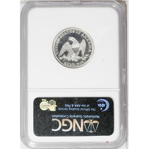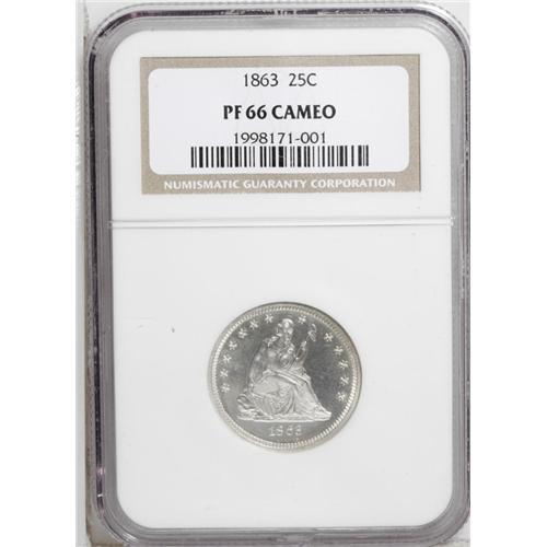 <B>1863<25C> PR66 Cameo NGC.</B></I> Only 460 recorded proofs were produced of this Civil War-era issue, low even by the standards of the era. Only a handful of proofs have been certified so fine, Cameo or no, at both services, and this piece is tied with a couple of others as the finest Cameo piece certified (9/06). The surfaces are brilliant silver-white, with good field-device contrast and essentially no visible distractions. The strike is full. The date digits are light, airy, and dainty, and a bit irregularly shaped. <BR><BR><B>Important not