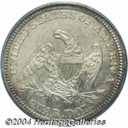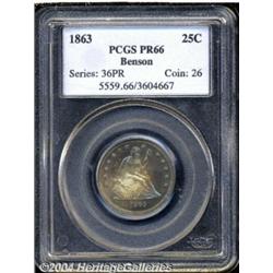 <B>1863<25C> PR66 PCGS.</B></I> Ex: Benson Collection. The obverse is richly toned in variegated steel-blue, crimson, lavender, and golden-orange colors, while the reverse displays a thin veil of faint golden-brown patination. A noticeable contrast exists between the devices and moderately reflective fields. No mentionable contact marks are apparent on the virtually pristine surfaces. Only 460 proofs were minted in this year. Population: 7 in 66, 0 finer (3/04).<BR><I>Ex: Benson Collection, Part II (Ira & Larry Goldberg, 2/02), lot 715, which realized $9,775.</B></I><BR><I>From the JFS Collection.</B></I> <BR><BR><B>Important notice:</B> Heritage usually auctions material at the rate of 200-250 lots per hour. On some occasions eBay Live bid software or the Internet may not be able to keep up with the pace of the auction. We recommend placing a realistic absentee bid now as insurance to avoid disappointment. Occasionally the auctioneer may eliminate or reject an eBay Live bid, and the auctioneer may also reopen a lot after the close of the eBay live bidding (usually because we missed an audience bid), and may reject your bid even if it shows you as the winning bidder. By bidding via eBay Live, you agree that Heritage may award the lot to another bidder at its sole discretion under the circumstances described above or any other reasonable circumstances. Since eBay bids are not shown to us until we open the lot on the floor, we treat those bids just like floor bids. In most cases the floor responds before the eBay bid is presented to us, due to Internet lag time, so for consistency we have made it a policy that floor bids are always considered first over tie eBay live bids. Also please note that all Heritage lots purchased through eBay Live carry a 20% Buyer's Premium. Please make sure you read the Terms and Conditions before you bid. </span></font></tr></table></td></tr></table>