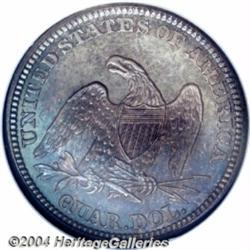 <table><tr><td><table><tr><td>1863 25C PR67 NGC. The Philadelphia Mint produced far fewer Seated Quarters in 1863 than it did in 1862. The latter year witnessed a production of just 191,600 business strikes and 460 proofs. Both formats are condition rarities with the present Superb Gem tied with one other as the finest certified proof at NGC (3/04). The originality is at once both undeniable and breathtaking. The obverse is overlaid in green, golden, red, and blue hues, the reverse is more extensively patinated with a rich cobalt-blue and a copper-pink center. Needle sharp striking detail characterizes all devices, which are equally as blemish-free as the smooth, placid fields. A spectacular proof Seated Quarter, and an important bidding opportunity for the advanced specialist. Population: 2 in 67, 0 finer (3/04). <BR><BR><B>Important notice:</B> Heritage usually auctions material at the rate of 200-250 lots per hour. On some occasions eBay Live bid software or the Internet may not be able to keep up with the pace of the auction. We recommend placing a realistic absentee bid now as insurance to avoid disappointment. Occasionally the auctioneer may eliminate or reject an eBay Live bid, and the auctioneer may also reopen a lot after the close of the eBay live bidding (usually because we missed an audience bid), and may reject your bid even if it shows you as the winning bidder. By bidding via eBay Live, you agree that Heritage may award the lot to another bidder at its sole discretion under the circumstances described above or any other reasonable circumstances. Since eBay bids are not shown to us until we open the lot on the floor, we treat those bids just like floor bids. In most cases the floor responds before the eBay bid is presented to us, due to Internet lag time, so for consistency we have made it a policy that floor bids are always considered first over tie eBay live bids. Also please note that all Heritage lots purchased through eBay Live carry a 20% Buyer's Premium. Please make sure you read the Terms and Conditions before you bid. <BR><BR><B>IMPORTANT ANNOUNCEMENT ABOUT RESERVES:</B> Heritage now divulges all reserves on its web site 7 days before every auction. If you want to know whether the reserve on this lot has been met, and if not, what the reserve amount is, please visit this lot page on the HeritageCoin.com web site, or email: bid@HeritageGalleries.com </span></font></td></tr></table></td></tr></table>