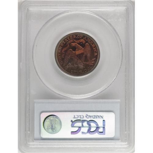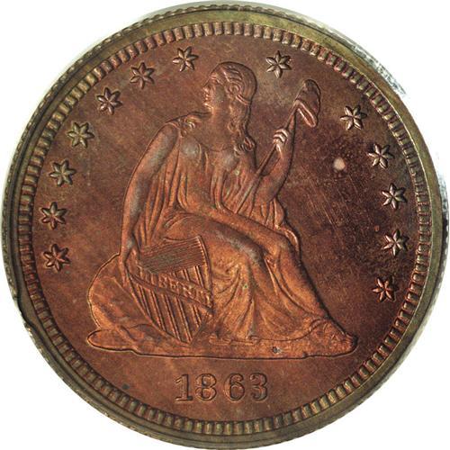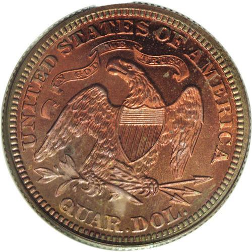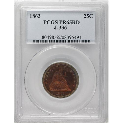 <B>1863 25C Quarter Dollar, Judd-336, Pollock-408, R.7, PR65 Red PCGS.</B></I> The obverse features the regular Seated Liberty obverse, but the reverse shows the motto IN GOD WE TRUST added to a scroll above the eagle, of the type adopted in 1866. Struck in copper with a reeded edge. According to the Judd pattern reference, these transitional patterns were "struck at a later date," perhaps in 1865, with resurrected proof dies. Fantasy pieces as bait for numismatic trade? This example offers brilliant, deep cherry-red surfaces on the obverse with a patch of magenta near the rim. The reverse shows flaming sunset-orange with more substantial magenta near the lower half. A spectacular piece.<BR><BR><b>Shipping:</b> Coin/Currency (<a target="_blank" href="http://www.heritageauctions.com/common/shipping.php">view shipping information</a>)