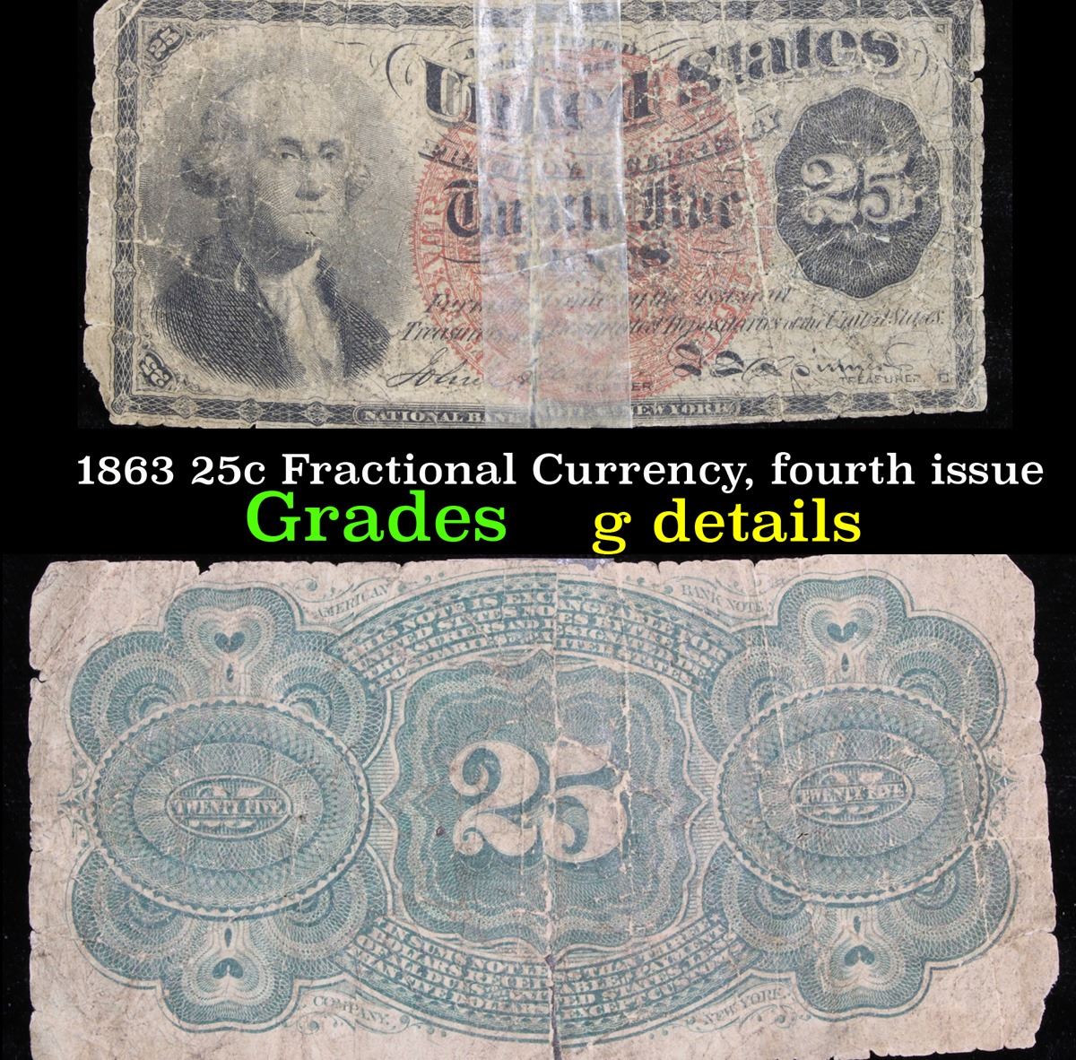 1863 25c Fractional Currency, fourth issue Grades. FR# 1308. Fractional or postage currency has a rich history. At the beginning of the Civil War people starting hoarding coins for their precious metal content. Coins became difficult to find because of the hoarding. People started to try to use stamps instead of coins as a means of commerce. The government decided to help ease the hoarding issue by issuing “paper coins” also known as postage currency or fractional currency. Fractional currency was first issued on August 21, 1862 and they were last issued on February 15, 1876. Three cents, five cents, ten cents, twenty-five cents, and fifty cents notes were all issued. Fractional currency is physically smaller than other United States money. It also does not have a serial number.