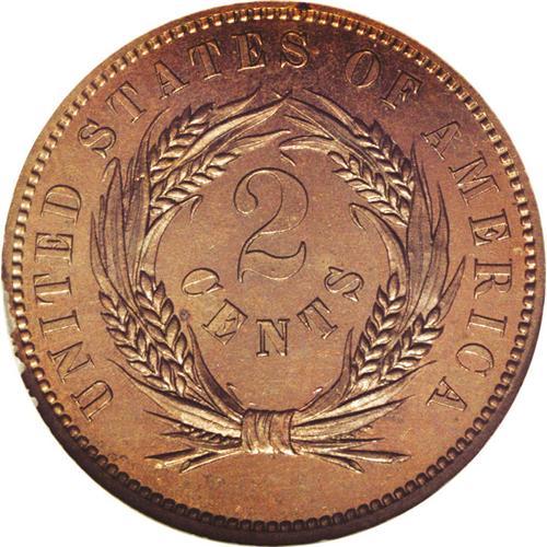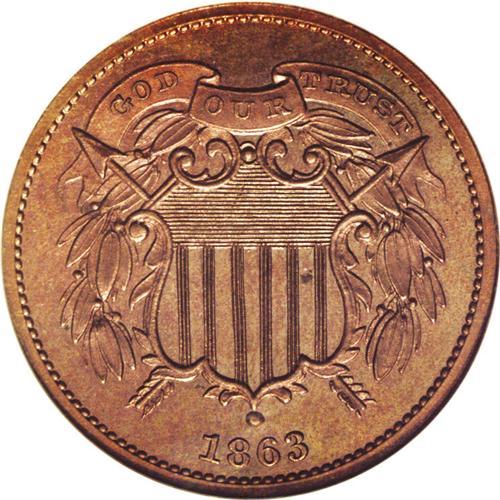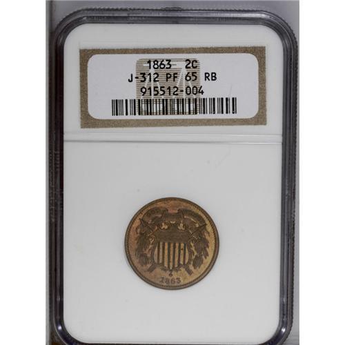 <B>1863<2C> Two Cents, Judd-312, Pollock-377, R.4, PR65 Red and Brown NGC.</B></I> Both dies are similar to those adopted for the business strike two cent piece in 1864, except that the motto reads GOD OUR TRUST and the word CENTS is sharply curved on the reverse. Struck in bronze with a plain edge. A lovely, moderately reflective Gem. The otherwise orange-brown coloration yields to rich olive patina on the obverse. A minor tick concealed in the shield, but otherwise mark-free.<BR><I>Ex: October Long Beach Signature (Heritage, 10/00), lot 8133.</B></I><BR><I>From The Antigo Collection.</B></I>