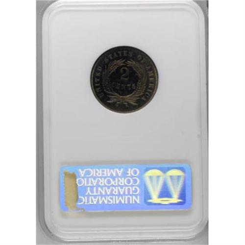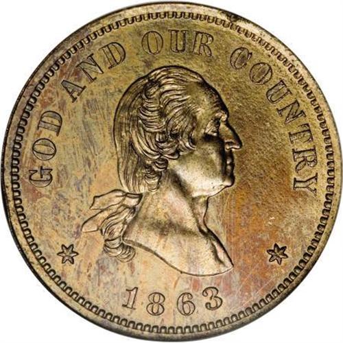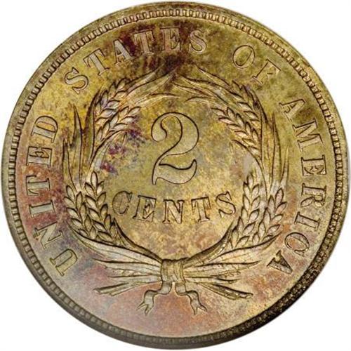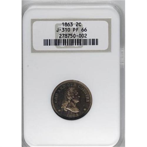 <B>1863 2C Two Cents, Judd-310, Pollock-375, Low R.7, PR66 NGC.</B></I> The reverse closely resembles the regular dies 1864 two cent piece, while the obverse exhibits a bust of Washington with the date below. Washington faces right, and has a ribbon binding his hair near his shoulder. GOD AND OUR COUNTRY consumes much of the obverse border. Judd-305 through Judd-311 provide the first portrait of the first president on U.S. coinage, if the privately issued Getz patterns are excluded. Struck in copper-nickel with a plain edge. Only a half dozen pieces are believed extant today. Deeply reflective, the surfaces display attractive red, lilac, and yellow iridescence over each side. This is the highest graded example of this rarity at both of the major services.<BR><BR><b>Shipping:</b> Coins & Currency (<a target="_blank" href="http://www.heritageauctions.com/common/shipping.php">view shipping information</a>)