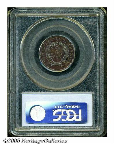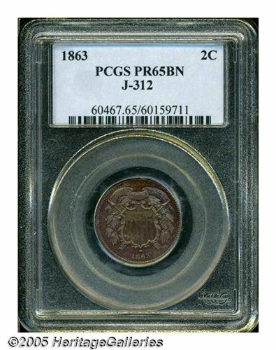 <B>1863<2C> Two Cents, Judd-312, Pollock-377, R.4, PR65 Brown PCGS.</B></I> Similar to the adopted two cent piece of the following year, except that the motto reads GOD OUR TRUST on the obverse, and the word CENTS is sharply curved within the wreath on the reverse. The wreath is tightly bound with no trailing ribbon ends. Struck in copper or bronze, with a plain edge. Deeply mirrored with equally deep blue, brown, and violet patina over each side. A lovely Gem example of this popular pattern.