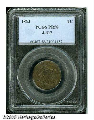<B>1863<2C> Two Cents, Judd-312, Pollock-377, R.4, PR58 PCGS.</B></I> Similar to the adopted two cent piece of the following year, except that the motto reads GOD OUR TRUST on the obverse, and the word CENTS is sharply curved within the wreath on the reverse. The wreath is tightly bound with no trailing ribbon ends. Struck in copper or bronze, with a plain edge. A lightly marked chocolate-brown example. Hints of circulation wear are noted on OUR and the leaf veins.