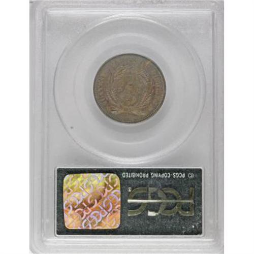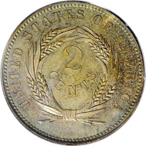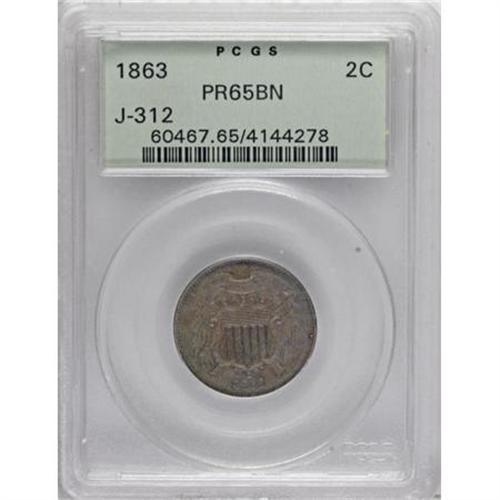 <B>1863 2C Two Cents, Judd-312, Pollock-377, R.4, PR65 Brown PCGS.</B></I> The obverse is similar to the regular issue obverse of 1864, with GOD OUR TRUST on the ribbon above the shield. The reverse shows the denomination 2 CENTS sharply curved in a wreath with the legend UNITED STATES OF AMERICA around. Struck in bronze with a plain edge. A fairly common pattern; the USPatterns.com website notes that examples vary in weight from 76 to 101 grains. Crisply defined on each side, the surfaces are deep brown with a hazy overlay of gray-blue patina. <BR><BR><b>Shipping:</b> Coins & Currency (<a target="_blank" href="http://www.heritageauctions.com/common/shipping.php">view shipping information</a>)