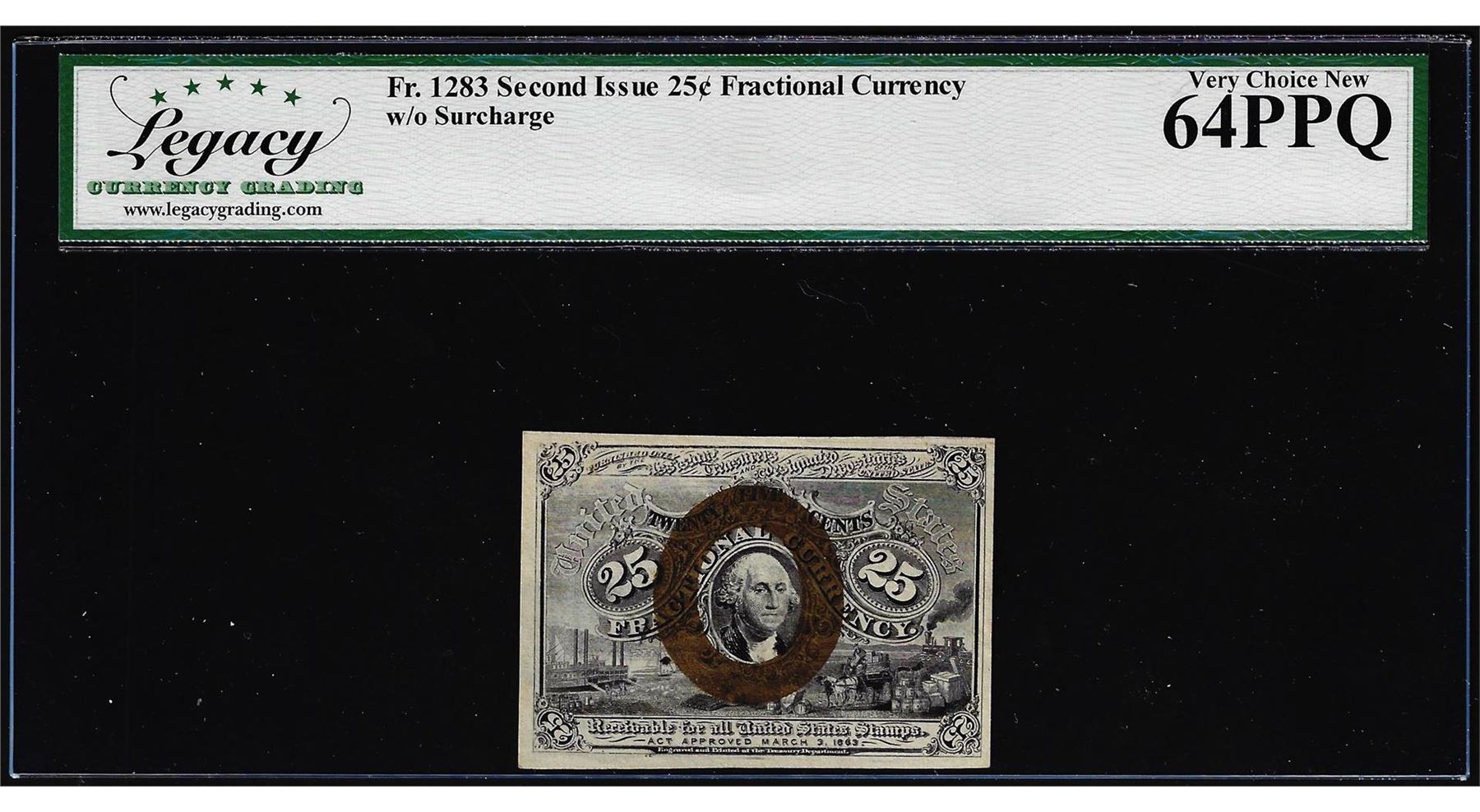 One 1863 2nd Issue 10 Cents Fractional Currency Note Fr.1283 Legacy Very Choice New 64PPQ. Legacy Graded.