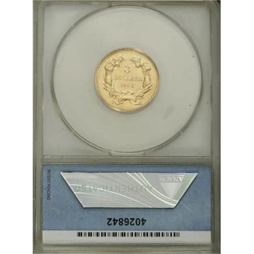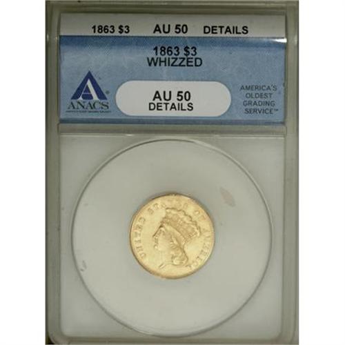 <B>1863 $3 --Whizzed--ANACS. AU50 Details.</B></I> NGC Census: (7/164). PCGS Population (13/83). Mintage: 5,039. Numismedia Wsl. Price for NGC/PCGS coin in AU50: $1,775. (#7984)<BR><BR><B>Coin Engraver:</B> James B. Longacre<BR><BR><b>Shipping:</b> Coins & Currency (<a target="_blank" href="http://www.heritageauctions.com/common/shipping.php">view shipping information</a>)