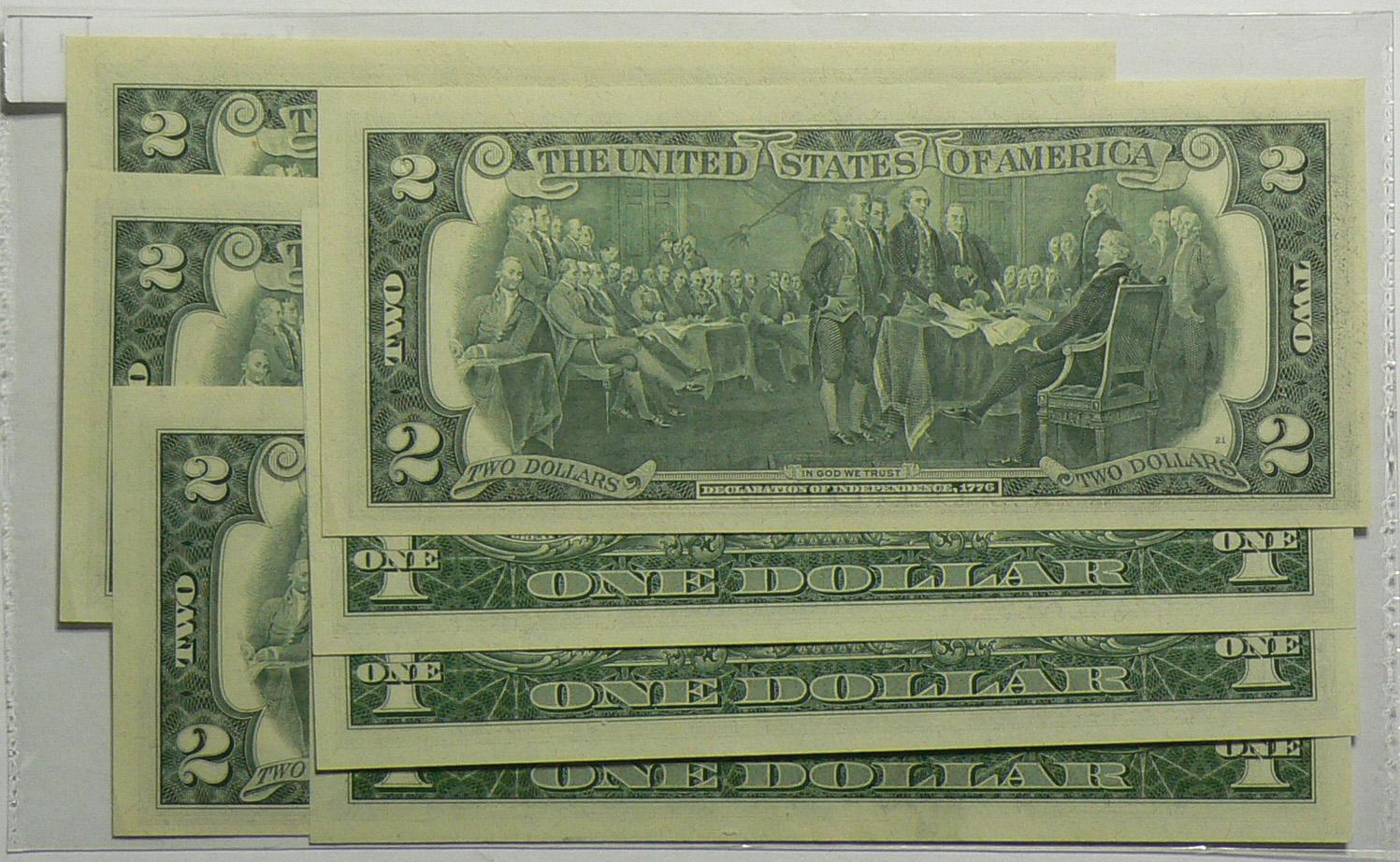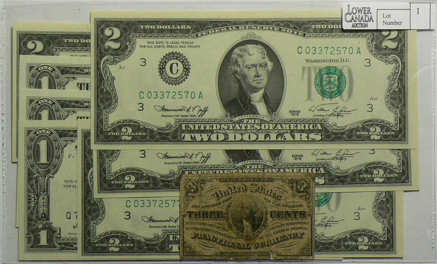 1863, 3 Cents, FR #1226, VG, 1957, One Dollar x 3, UNC, FR #1619 & 1976, Two Dollars x 4, UNC, FR #1935C. Lot of 8 notes.