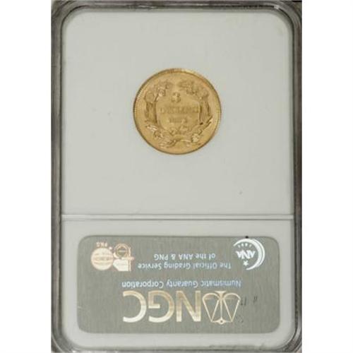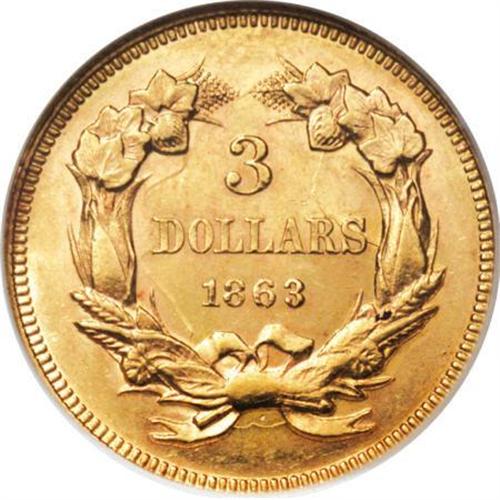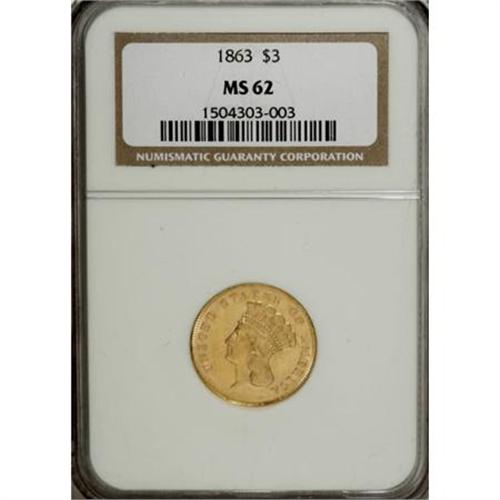 <B>1863 $3 MS62 NGC.</B></I> Mint State examples of the 1863 three dollar gold piece are hard to locate, although a few high-grade examples are known. Highly lustrous surfaces exhibit brilliant yellow color with wisps of pink toning, while scattered abrasions on each side limit the grade. Prominent clash marks are present, as nearly always for the date. Population: 9 in 62, 22 finer (6/07).<BR><I>From The DAX Collection.</B></I><BR><BR><B>Coin Engraver:</B> James B. Longacre<BR><BR><b>Shipping:</b> Coins & Currency (<a target="_blank" href="http://www.heritageauctions.com/common/shipping.php">view shipping information</a>\)