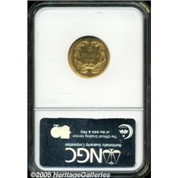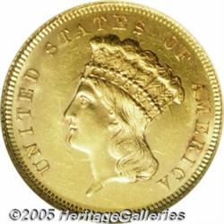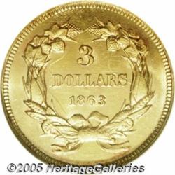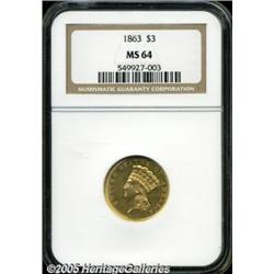 <B>1863 $3 MS64 NGC.</B></I> Perhaps 200 1863 Three Dollar gold pieces are extant out of a limited original mintage of 5,000 business strikes. This coin is typical of the issue in that both sides display clashmarks (as struck) and striations (also as produced) in the fields. It is atypical because the luster is frosty in finish instead of satiny or semi-prooflike. Both sides are beautifully colored in reddish-gold shades with no singularly mentionable post-production distractions. Population: 7 in 64, 14 finer (2/05).