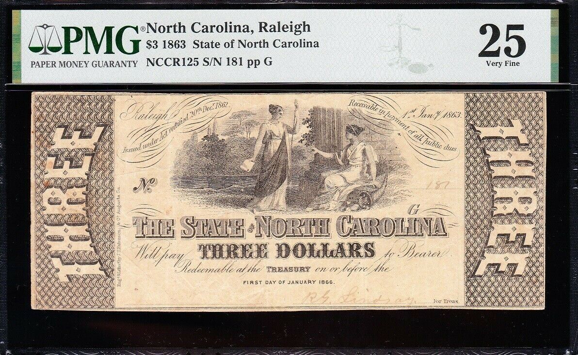 One 1863 $3 Raleigh NC Obsolete Note PMG 25.