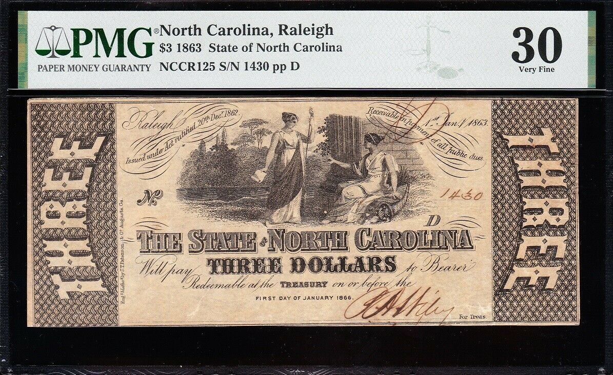 One 1863 $3 Raleigh NC Obsolete Note PMG 30.