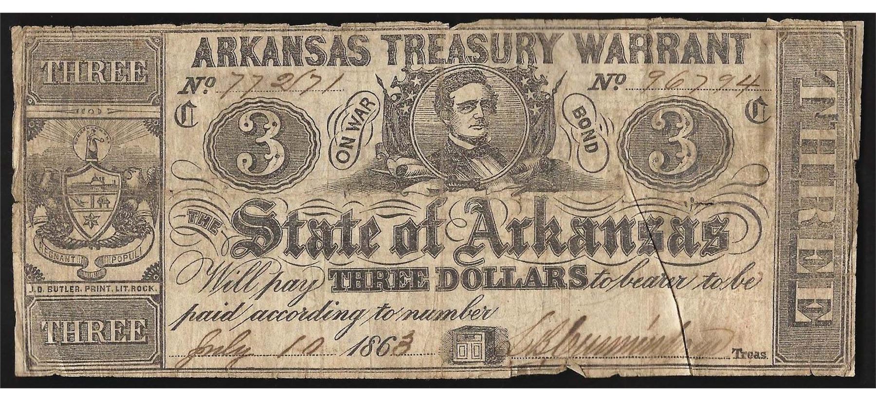 One 1863 $3 State of Arkansas Treasury Warrant Note.
