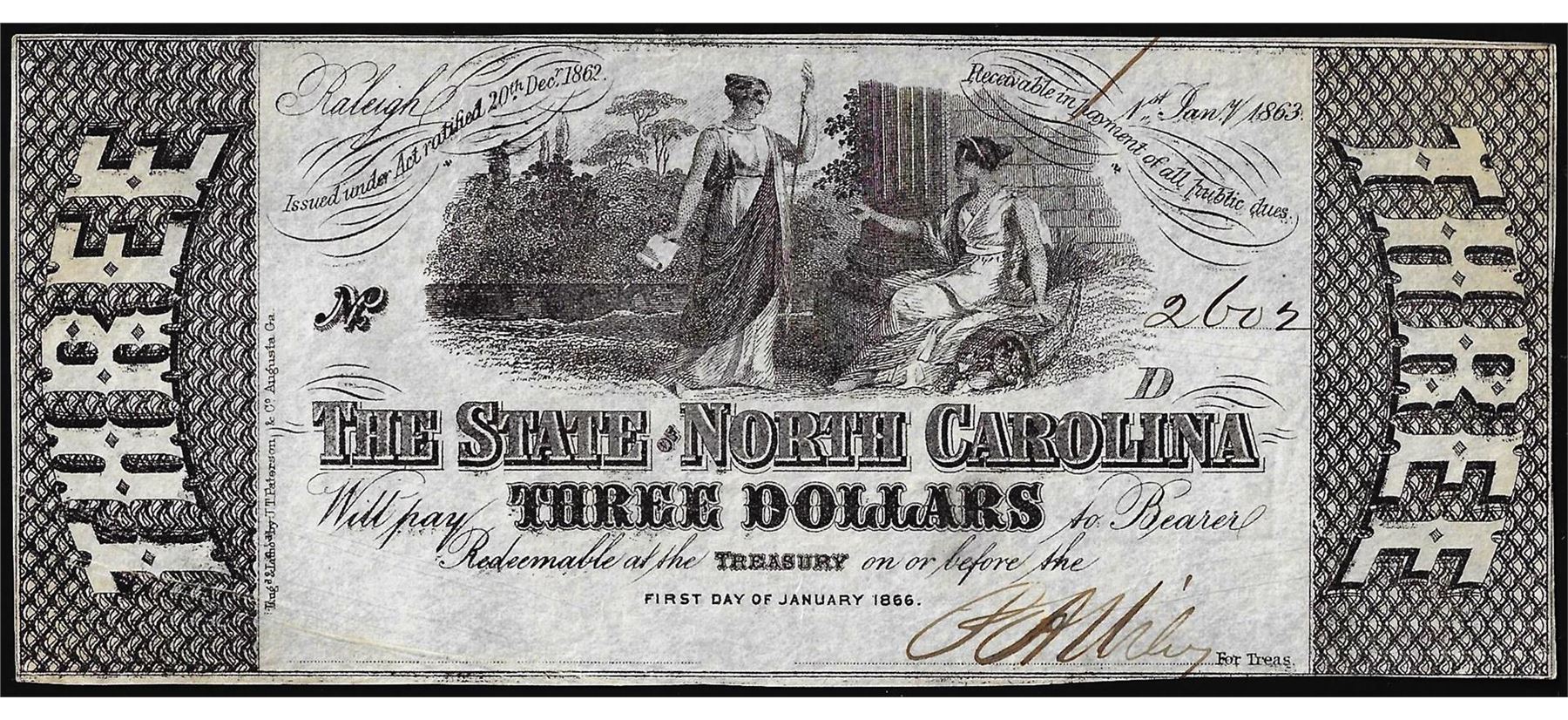 One 1863 $3 State of North Carolina Raliegh Obsolete Note.