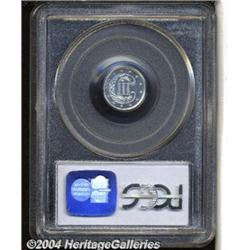 <B>1863<3C> Three Cent Silver, Judd-322, Pollock-387, High R.7, PR66 Deep Cameo PCGS.</B></I> Although described in the literature as "regular dies trial pieces," these are actually restrikes made in the early 1870s and sold as part of complete off-metal sets with the silver coinage of this year containing quarter, half dollar, and dollar which had the reverses of 1866 with the motto IN GOD WE TRUST above the eagle. These three cent dies were made from a hub which had the D in UNITED broken and may be a backdated novodel. Struck in aluminum with a plain edge. The obverse is this high quality specimen is heavily striated and, while similarly reflective, the reverse lacks this feature. A bit of striking softness is noted along the left side of both obverse and reverse. <BR><BR><B>Important notice:</B> Heritage usually auctions material at the rate of 200-250 lots per hour. On some occasions eBay Live bid software or the Internet may not be able to keep up with the pace of the auction. We recommend placing a realistic absentee bid now as insurance to avoid disappointment. Occasionally the auctioneer may eliminate or reject an eBay Live bid, and the auctioneer may also reopen a lot after the close of the eBay live bidding (usually because we missed an audience bid), and may reject your bid even if it shows you as the winning bidder. By bidding via eBay Live, you agree that Heritage may award the lot to another bidder at its sole discretion under the circumstances described above or any other reasonable circumstances. Since eBay bids are not shown to us until we open the lot on the floor, we treat those bids just like floor bids. In most cases the floor responds before the eBay bid is presented to us, due to Internet lag time, so for consistency we have made it a policy that floor bids are always considered first over tie eBay live bids. Also please note that all Heritage lots purchased through eBay Live carry a 20% Buyer's Premium. Please make sure you read the Terms and Conditions before you bid.