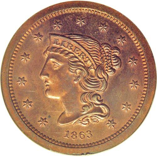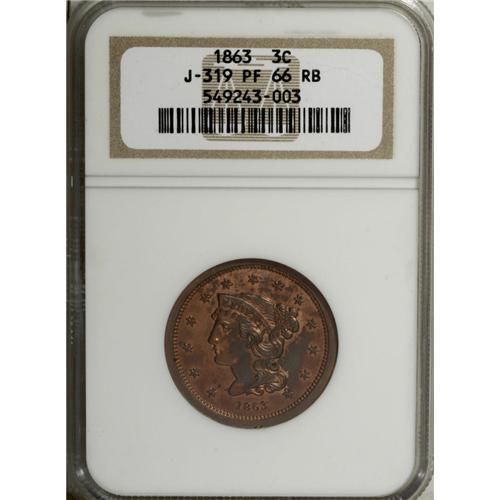 <B>1863 3C Three Cents, Judd-319 Restrike, Pollock-384, R.5-6, PR66 Red and Brown NGC.</B></I> The obverse is similar to the Braided Hair large cent design that was discontinued seven years earlier, only with much smaller digits in the date. The reverse has 3 CENTS in the center and is surrounded by a laurel wreath with UNITED STATES OF AMERICA at the margin. Struck in bronze or copper with a plain edge. The obverse displays splotchy steel-blue overtones, along with a few accompanying carbon spots, while more uniform mellowing is noticed on the reverse.<BR><BR><b>Shipping:</b> Coin/Currency (<a target="_blank" href="http://www.heritageauctions.com/common/shipping.php">view shipping information</a>)