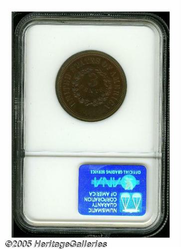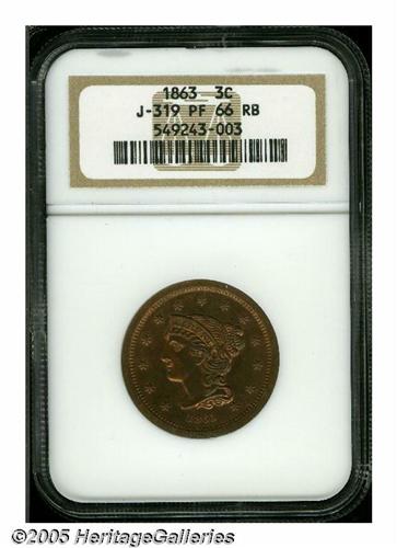 <B>1863<3C> Three Cents, Judd-319 Restrike, Pollock-384, R.5-6, PR66 Red and Brown NGC.</B></I> The obverse is similar to the Braided Hair Large cent design that was discontinued seven years earlier, only with much smaller digits in the date. The reverse has 3 CENTS in the center and is surrounded by a laurel wreath with UNITED STATES OF AMERICA at the margin. Struck in bronze or copper with a plain edge. The obverse displays splotchy steel-blue overtones, along with a few accompanying carbon spots, while more uniform mellowing is noticed on the reverse.<BR><I>From The Western Hills Collection.</B></I>