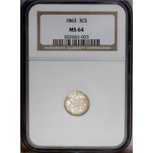 <B>1863<3CS> MS64 NGC.</B></I> Golden-brown toning adorns the obverse peripheries, while a somewhat heavy streak of dark verdigris patina extends diagonally across the upper reverse. The striking details are unusually sharp, and die striations are noted in the obverse fields. Highly lustrous and essentially distraction-free. Census: 23 in 64, 31 finer (1/06).