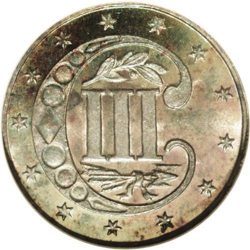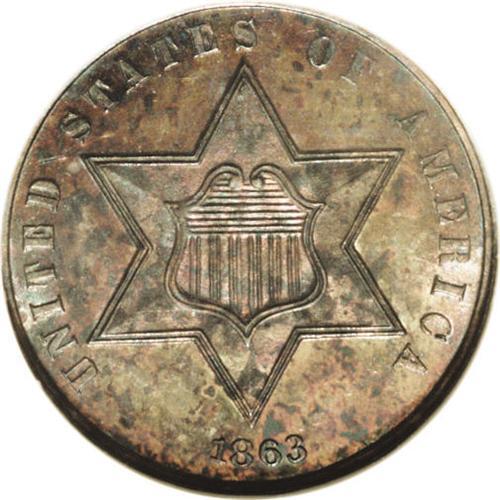 <B>1863<3CS> MS65 NGC.</B></I> The fields are deeply mirrored and flash forcefully through the rich, multilayered gray, rose, and sea-green toning that covers each side. Fully struck, and quite scarce as such, as most business strikes show considerable weakness, especially on the reverse stars or the center of the shield. The absence of clash marks also suggests an early blow from the dies. Only 21,000 pieces were struck. Certified in an older generation holder. Census: 12 in 65, 18 finer (4/06).
